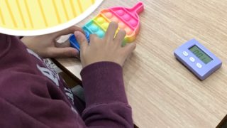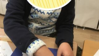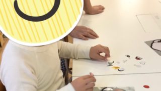 厚紙に、手袋やマフラー、体の形を貼って雪だるまの作品を作りました!左右が同じになるよう集中してシールの貼る位置を決めたり、マフラーの部分が剣になったりと男の子らしい創造力が発揮されました!