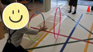 フラフープ縄跳びに挑戦をしました!フラフープを使うことで、手首を使う感覚、ジャンプのタイミングを確認していきます!しっかりと手を動かして、フラフープが足元に来たタイミングでジャンプします!最初はゆっくり回してジャンプのタイミングを確認しま...