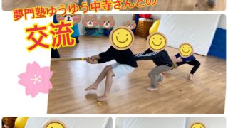 挨拶の後、夢門塾さんの2階の運動室で「ボール運び」と「綱引き」を夢門塾対キートで行いました。その際、夢門塾の先生より「対決ではあり...