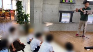 今日は帰りの会のフルート演奏の前にフルートの音の聴き比べをしてもらっています。1つは銀色の楽器、もう一つは金色をした楽器。一つ一つ吹いた後に職員からどっちの方を拭いたか当ててもらいました。