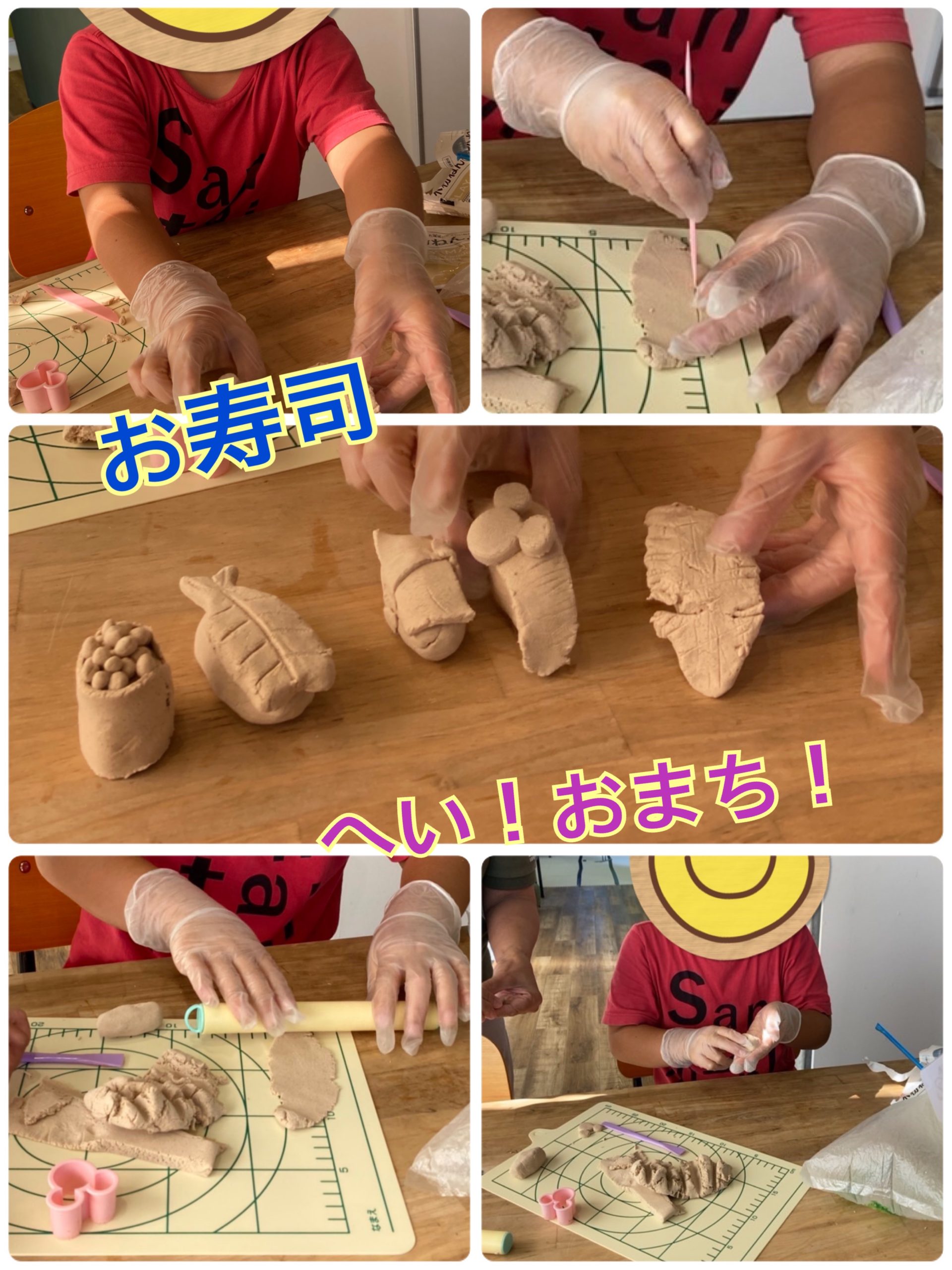 最初は、ローラーで平たく伸ばしたり、ヘラで切ったりして自由に遊んでいましたが、そのうちに四角く握り始めたかと思うと、「あ!お寿司作ろ❗️」と急に閃いたようで、たまご、エビ、サーモン、イクラ、カルビなど、様々なお寿司を作り始めました😊