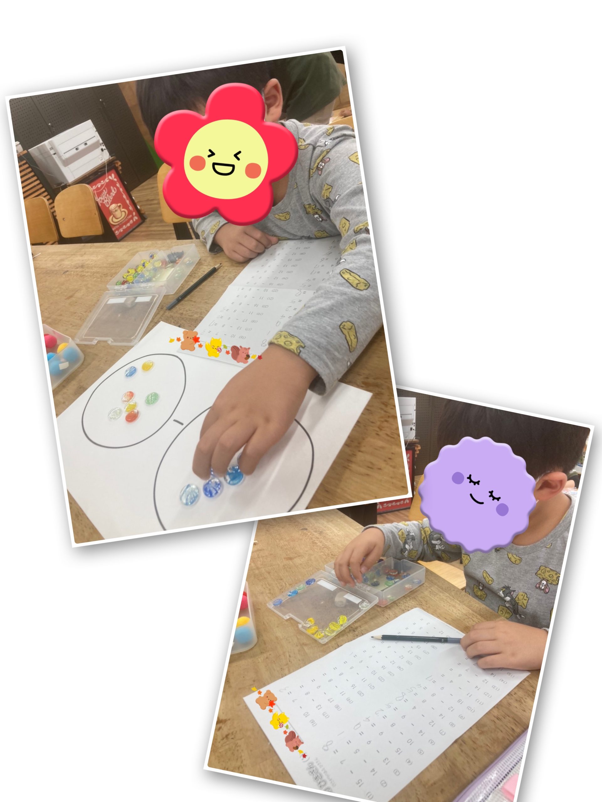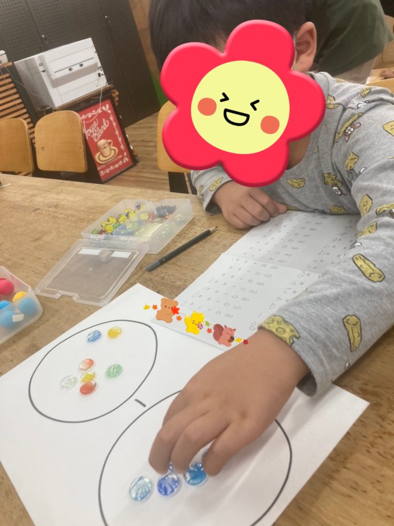 さぁ、左丸の中に何個残ったかな?というように自分の目でおはじきが何個残ったかを見て考えてもらうようにしました🎶