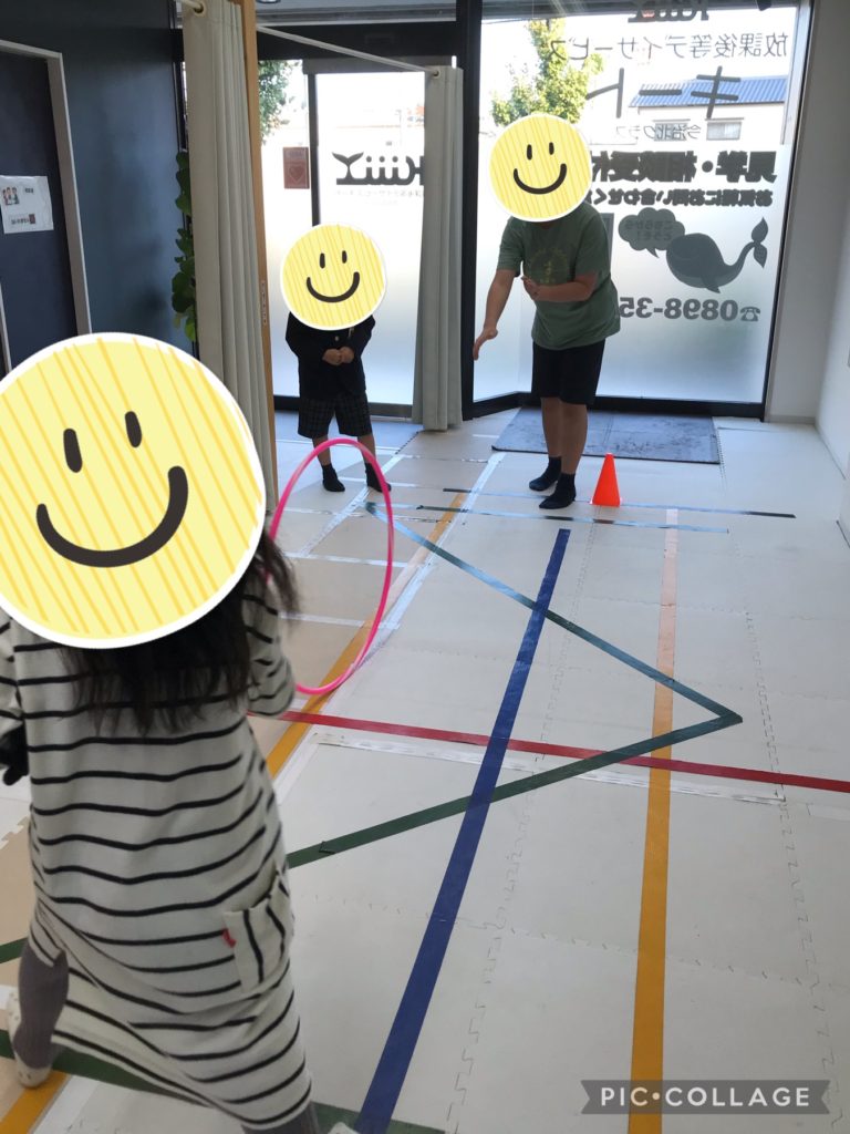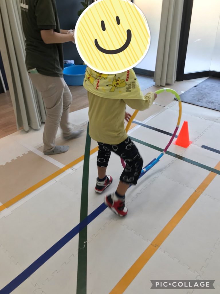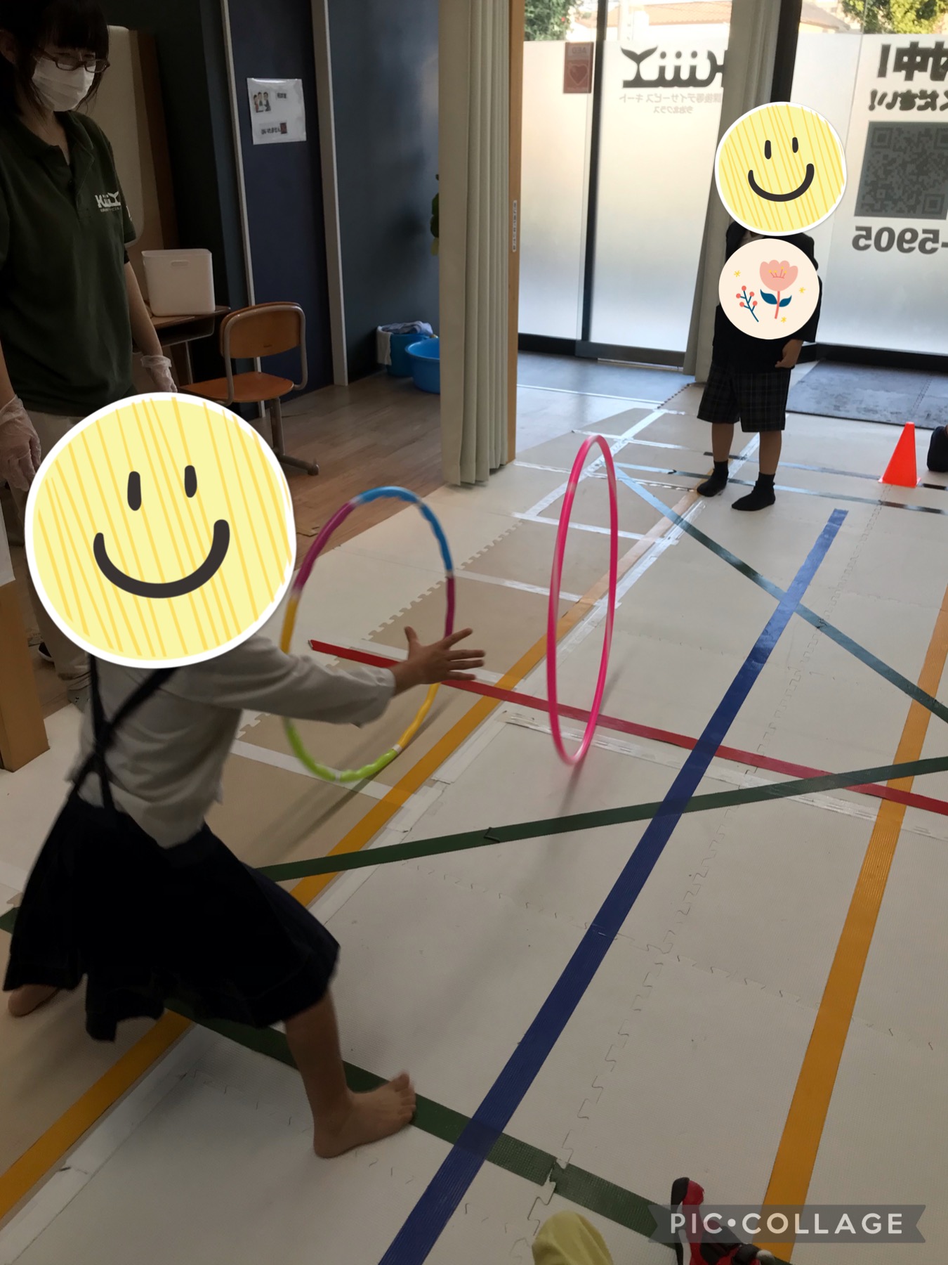 みんなでフラフープリレーをしました!今日は縦に転がしながら進めて行くルールでしています!倒れないよう少しずつ転がしながら進んだり、一気に転がして進んだりとそれぞれの得意なスタイルで楽しみました!コーンを周って帰って来たり、反対側に立ちフラフープを転がして渡したりとみんなで意見を出し合いながら元気に体を動かしました!フラフープ渡しでは、最初は力任せに押してすぐに倒れてしまっていましたが、何度も挑戦してコツをつかむと、フラフープをまっすぐに立てた状態を保ちつつ、力加減を調整しながら押すことができていました!上手く転がるのが楽しくて、2本渡しをしてみたりと順番に何度も何度も楽しみました!