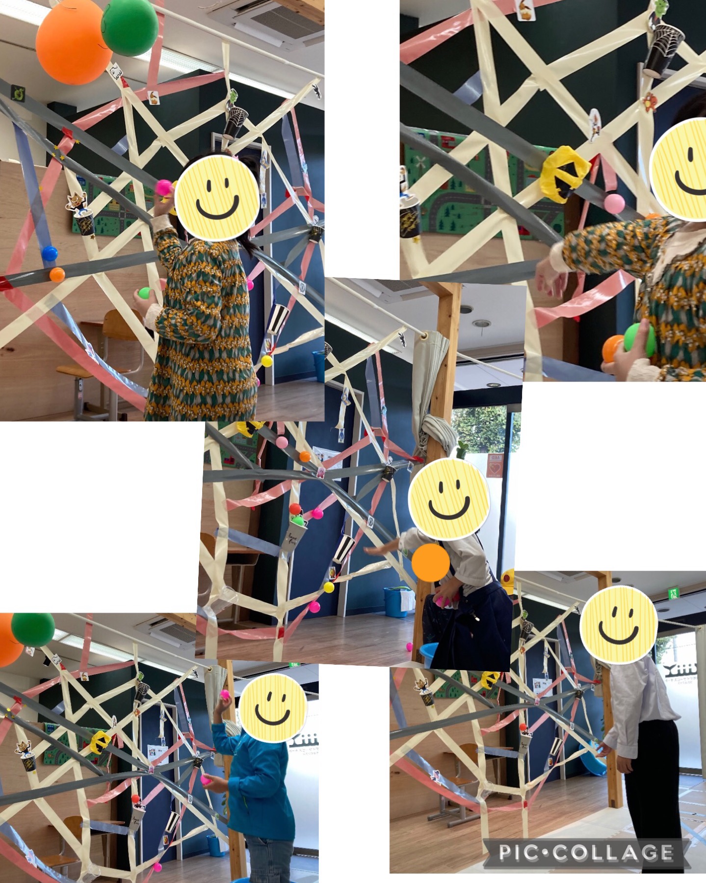 テープで作ったクモ🕷の巣🕸の至るところにオバケがいます。