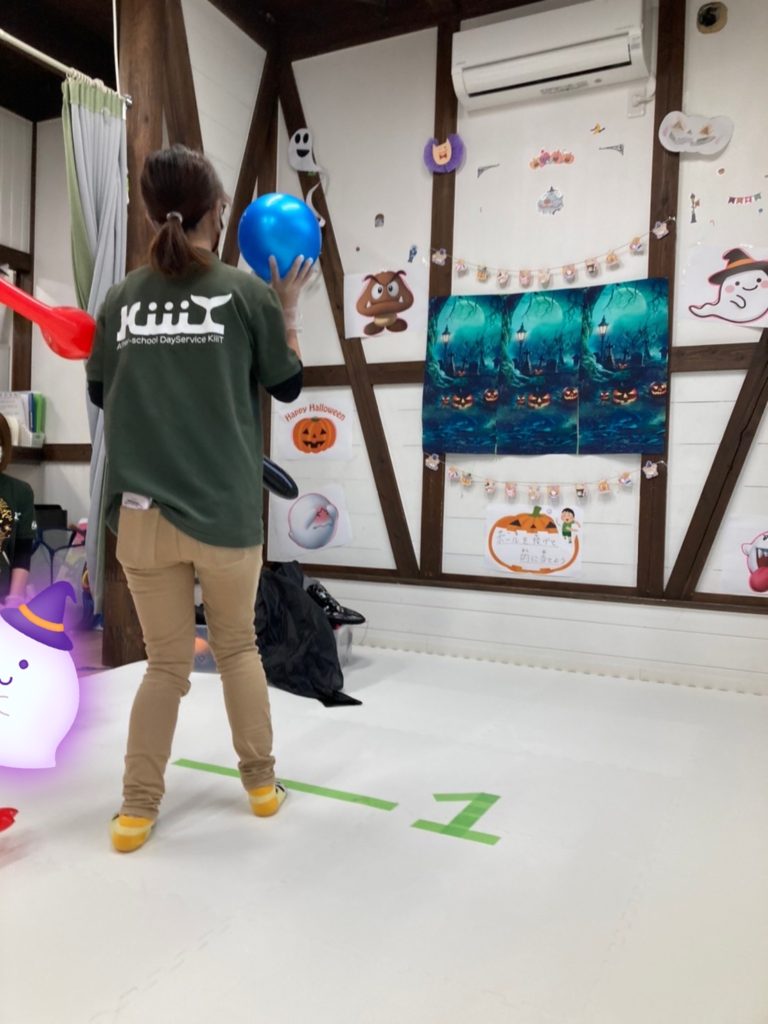 まずは職員がお手本を見せて「おばけ👻」に向かってボールを投げました!