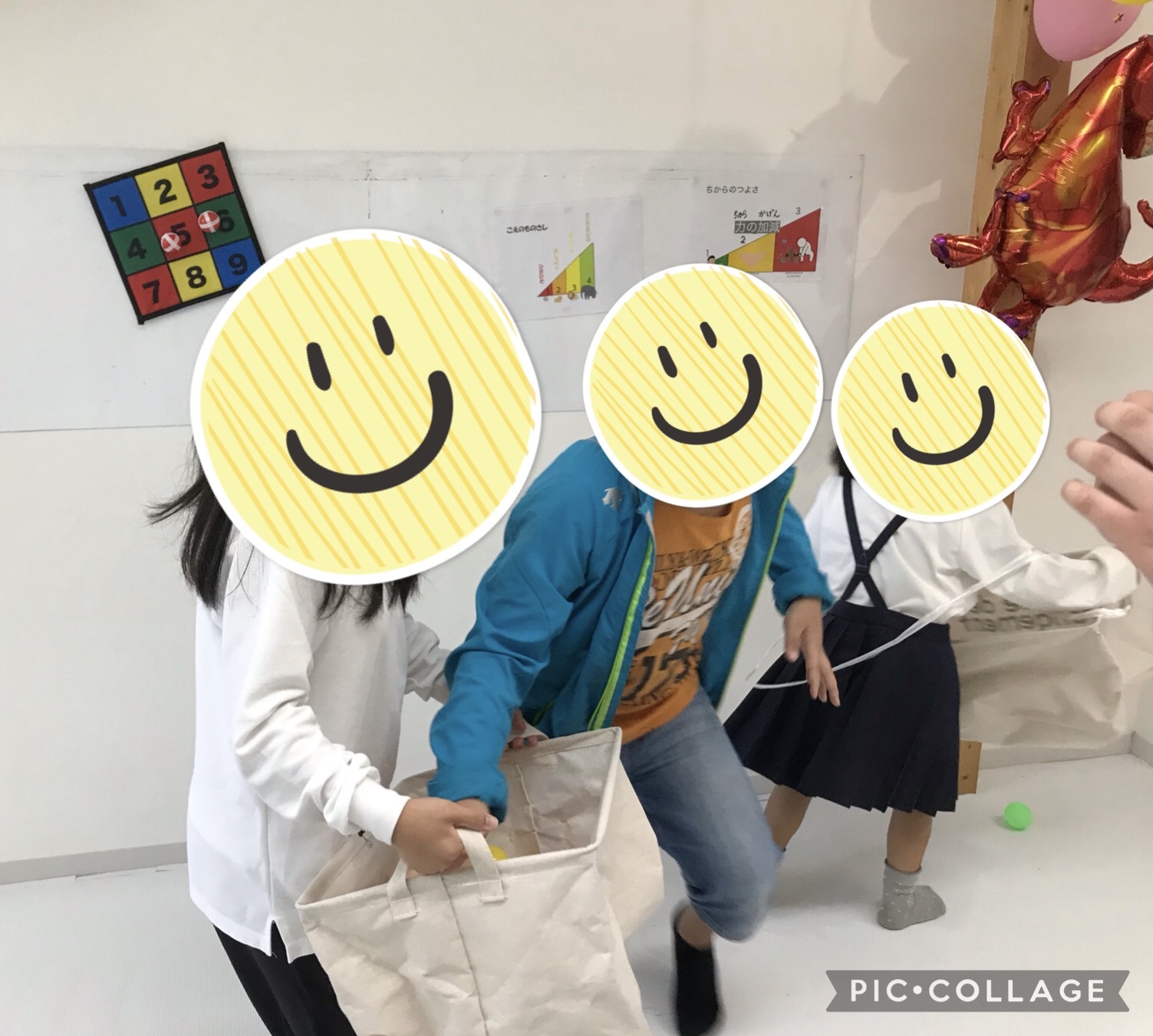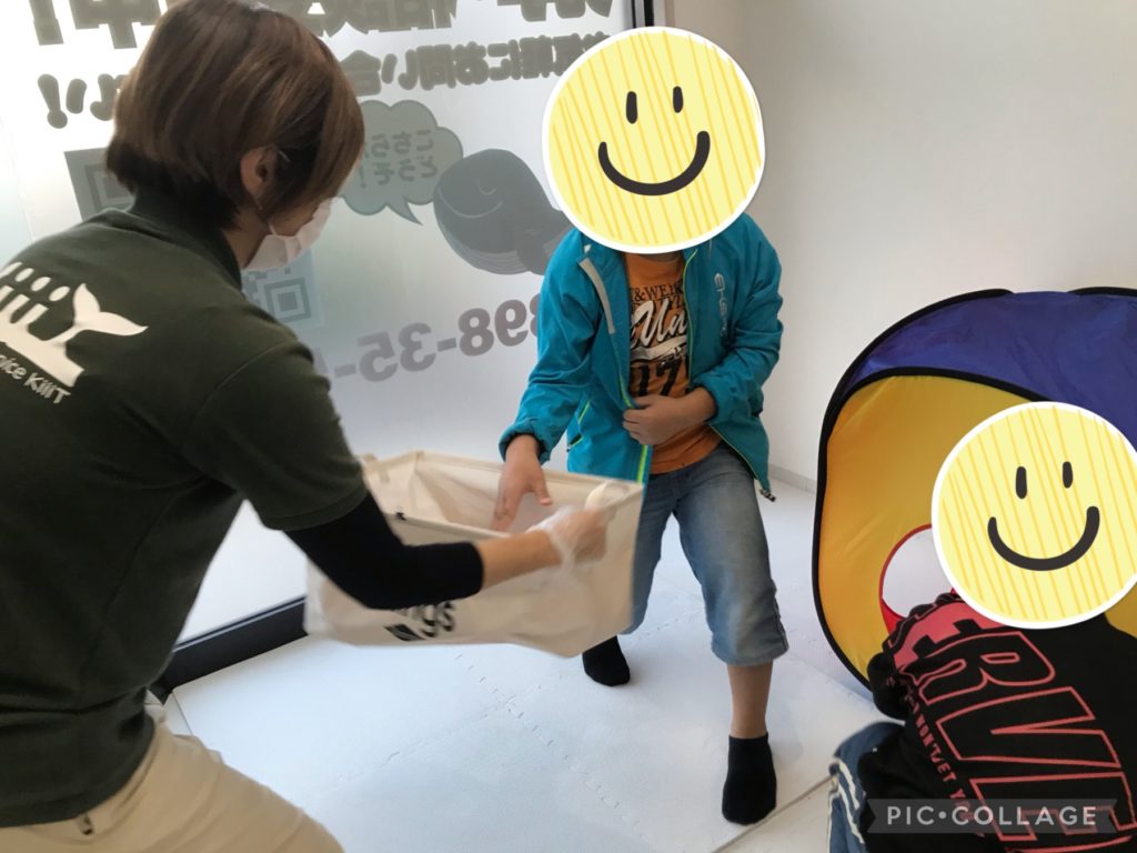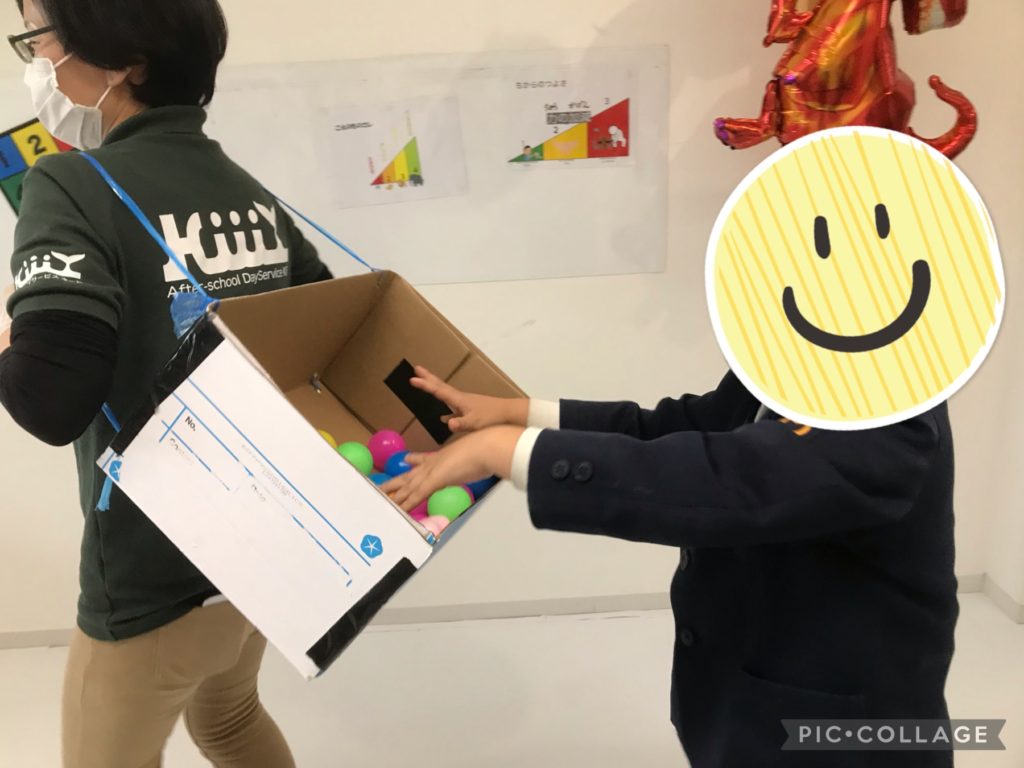 【今治北クラス】本日のできごと今日はみんなで移動玉入れをしました!職員が持ったり、背負った箱にボール投げずに入れるゲームです!ボールを投げない、箱を掴まないというルールでしました!職員と一緒に箱が動くのでなかなか入れるのは難しかったですが、箱をしっかりと狙ったり、職員の動きの速さや予測をして狙ったりとそれぞれ楽しく活動できました!1回目が終わると「カゴを持ってみたい!」と児童もカゴを持つ役に挑戦をしています!カゴを上下左右に振ったり、いろいろな場所に移動をしたりと工夫をしながら楽しく盛り上げてくれました!