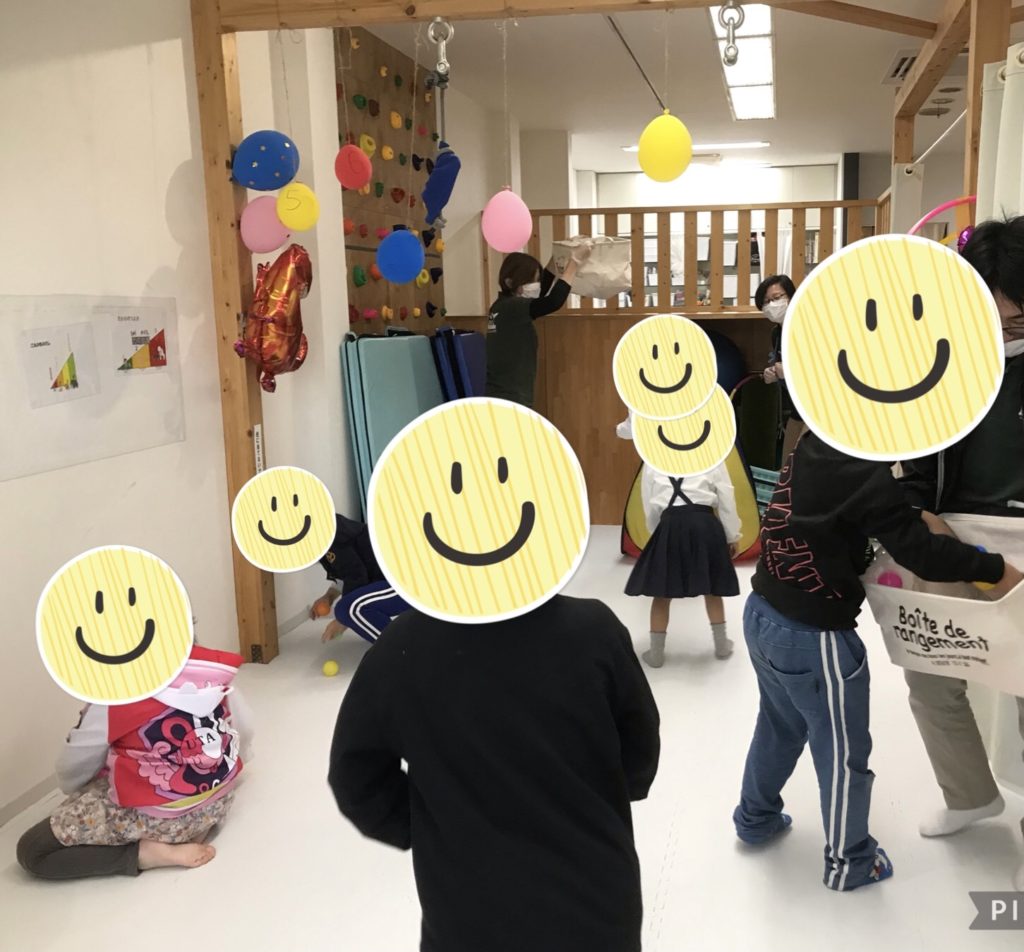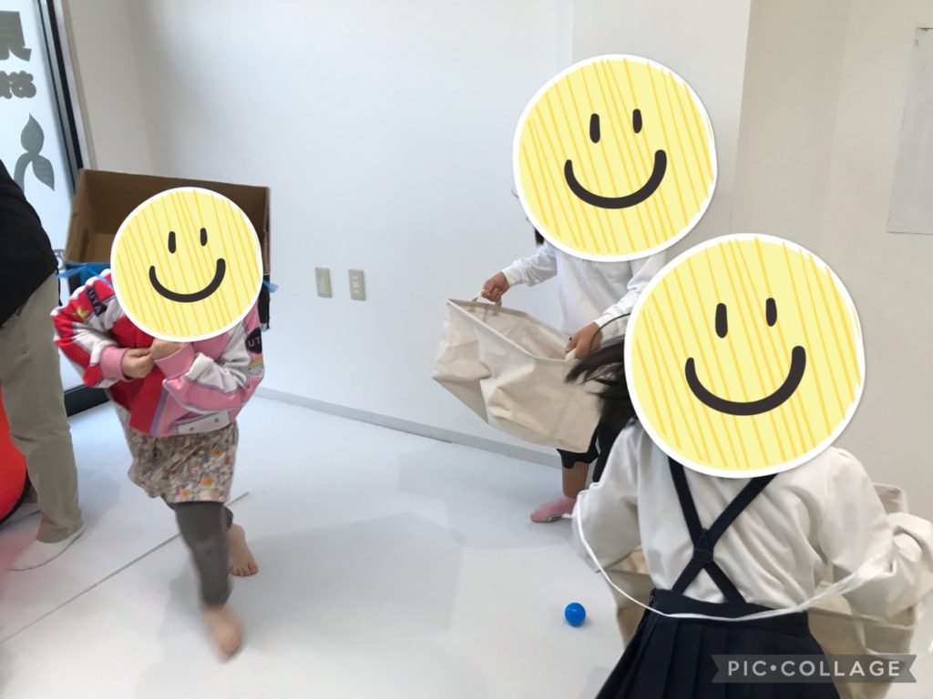 今日はみんなで移動玉入れをしました!職員が持ったり、背負った箱にボール投げずに入れるゲームです!ボールを投げない、箱を掴まないというルールでしました!職員と一緒に箱が動くのでなかなか入れるのは難しかったですが、箱をしっかりと狙ったり、職員の動きの速さや予測をして狙ったりとそれぞれ楽しく活動できました!1回目が終わると「カゴを持ってみたい!」と児童もカゴを持つ役に挑戦をしています!カゴを上下左右に振ったり、いろいろな場所に移動をしたりと工夫をしながら楽しく盛り上げてくれました!