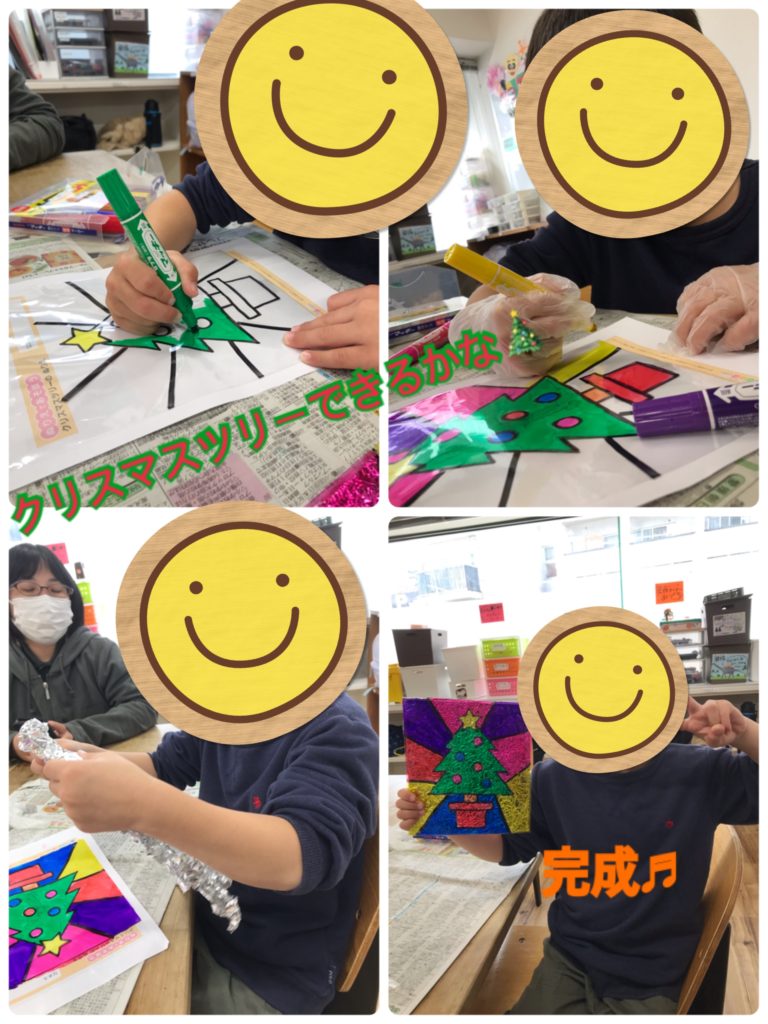 こども達と一緒に油性ペンとアルミホイルを使って、ステンドグラス風のクリスマス工作に取り組みました😄