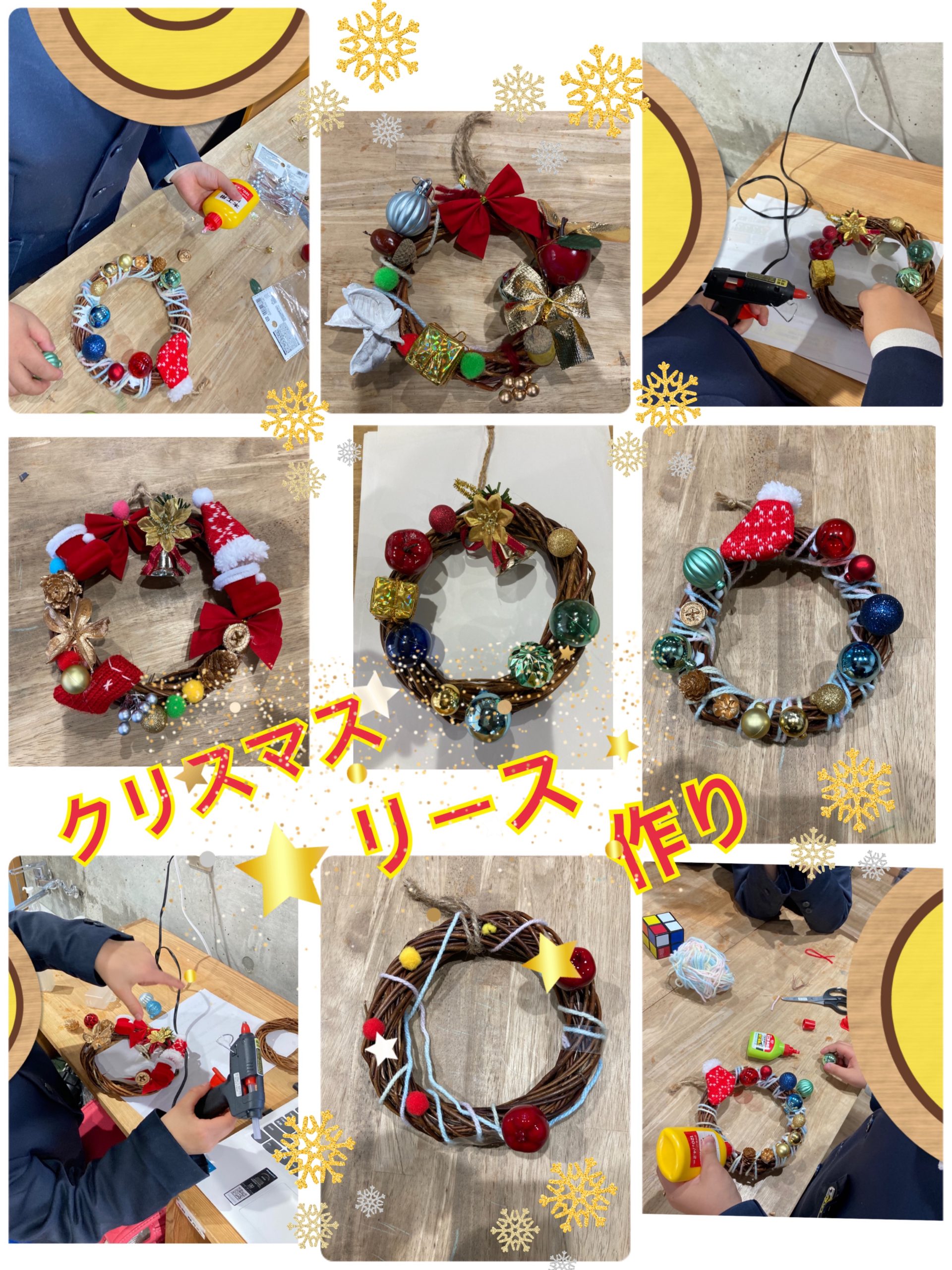沢山の材料の中から、ベルやリボンなど自分の好みの飾りを選び、リースにそれぞれボンドやグルーガンを使って、くっつけていきました😊