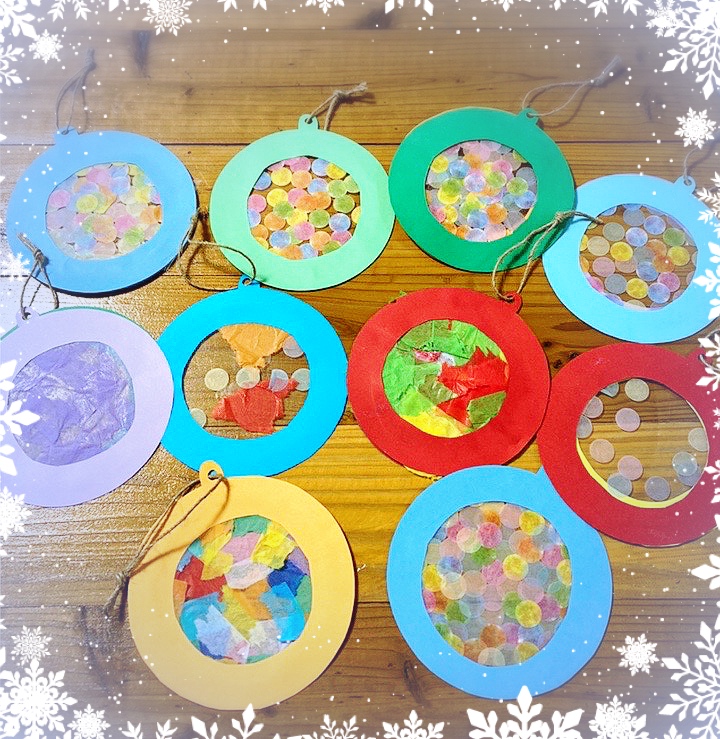 丸いプラ板に、お花紙やシールを貼り、丸い形を切り抜いた色画用紙に貼り付けて完成させます。