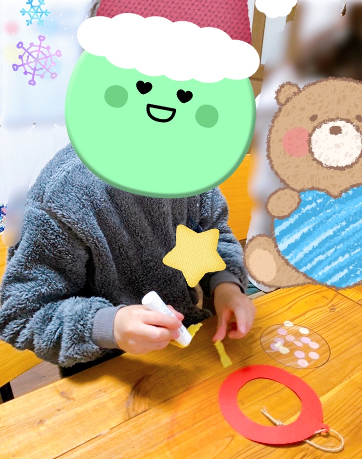 本日も、指先を使って、シールやお花紙を貼り、クリスマス飾りを作りました。