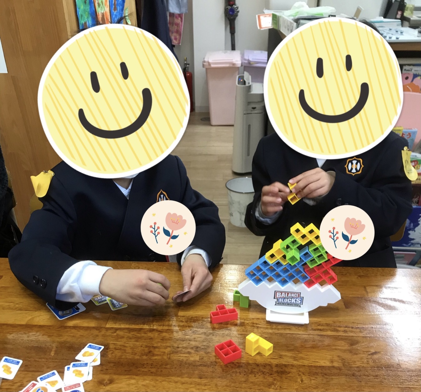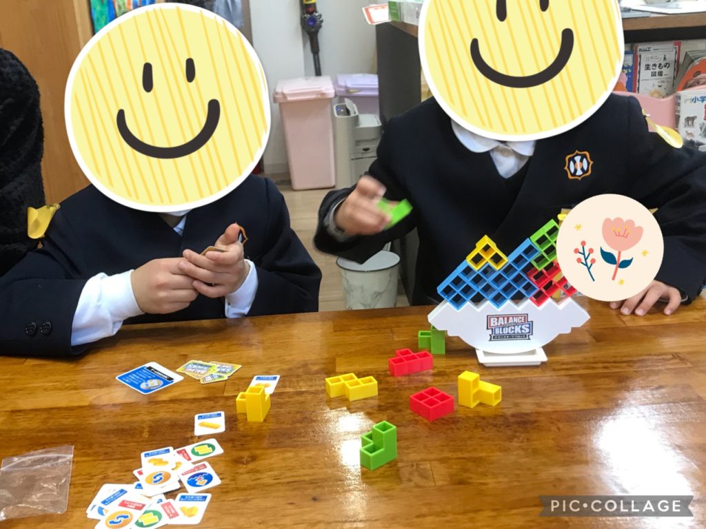 バランスキープブロックに挑戦しました!揺れるステージにブロックを順番に乗せていきます!最初にカードを引いて出たブロックを乗せていくルールなので、出たブロックの形や大きさを見て、崩さないようバランスを考える必要があります!始めは「ここに置いていったらいいね!」と形を見ながら、しっかりと置いていきました!だんだん積み上がってくると、少しの揺れでグラグラするのでハラハラドキドキでした!その分置く時にはより集中してゆっくりと置くことができていました!何度も挑戦をしながら最後は、どうやったら崩さないようにたくさん積めるかを、話し合って協力をしながら楽しみました!