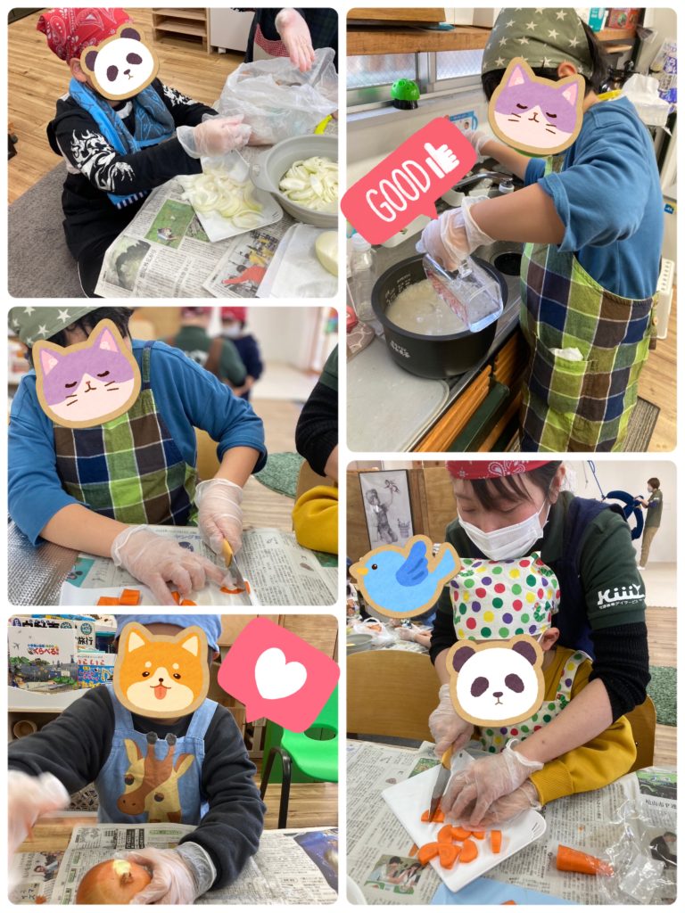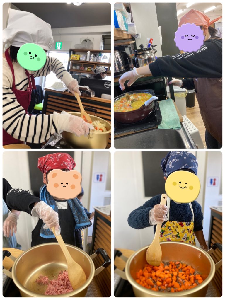 職員がみんなが切ってくれた野菜やお肉を炒めていると「僕もしてもいい?」と積極的にお手伝いをしてくれました😲✨️