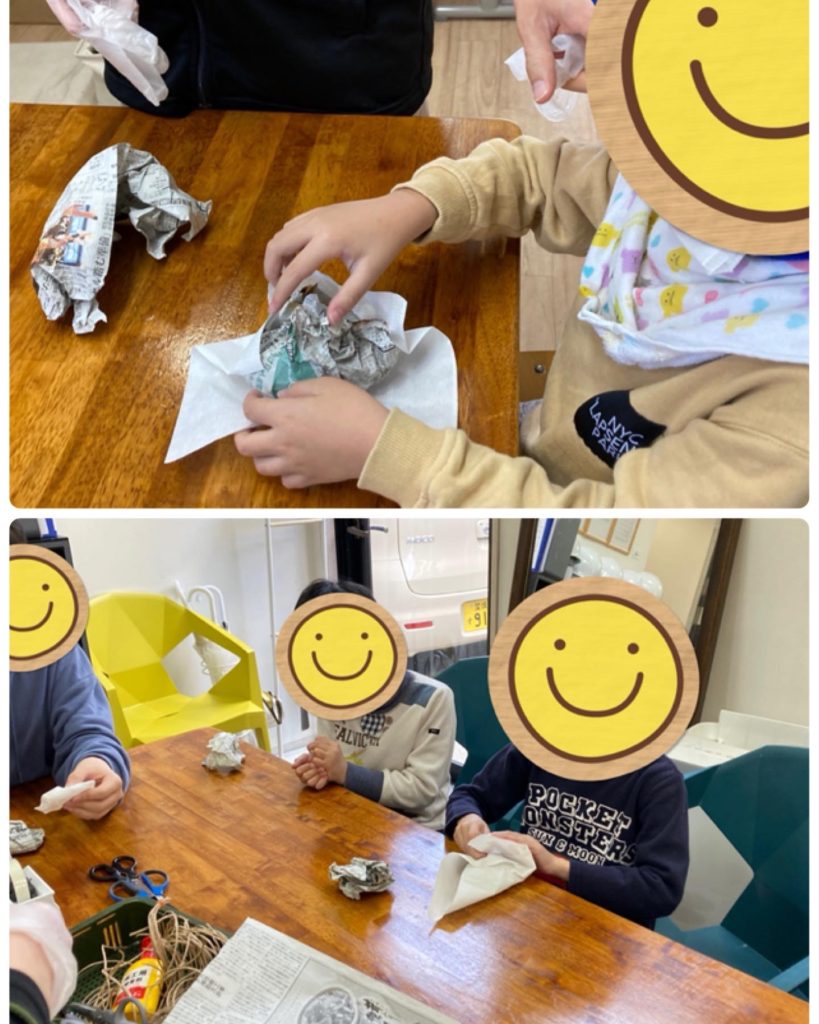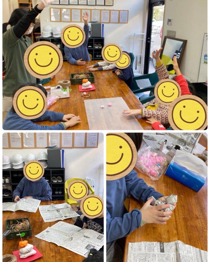 紙ヒモを使って手作りのしめ縄を作りました。ヒモをねじりながら巻き付けますが、ねっじっているうちに紐がバラバラになっていました。「難し〜い」と言われていましたがチャレンジするたびコツを掴み上手にねじって出来上がっています。