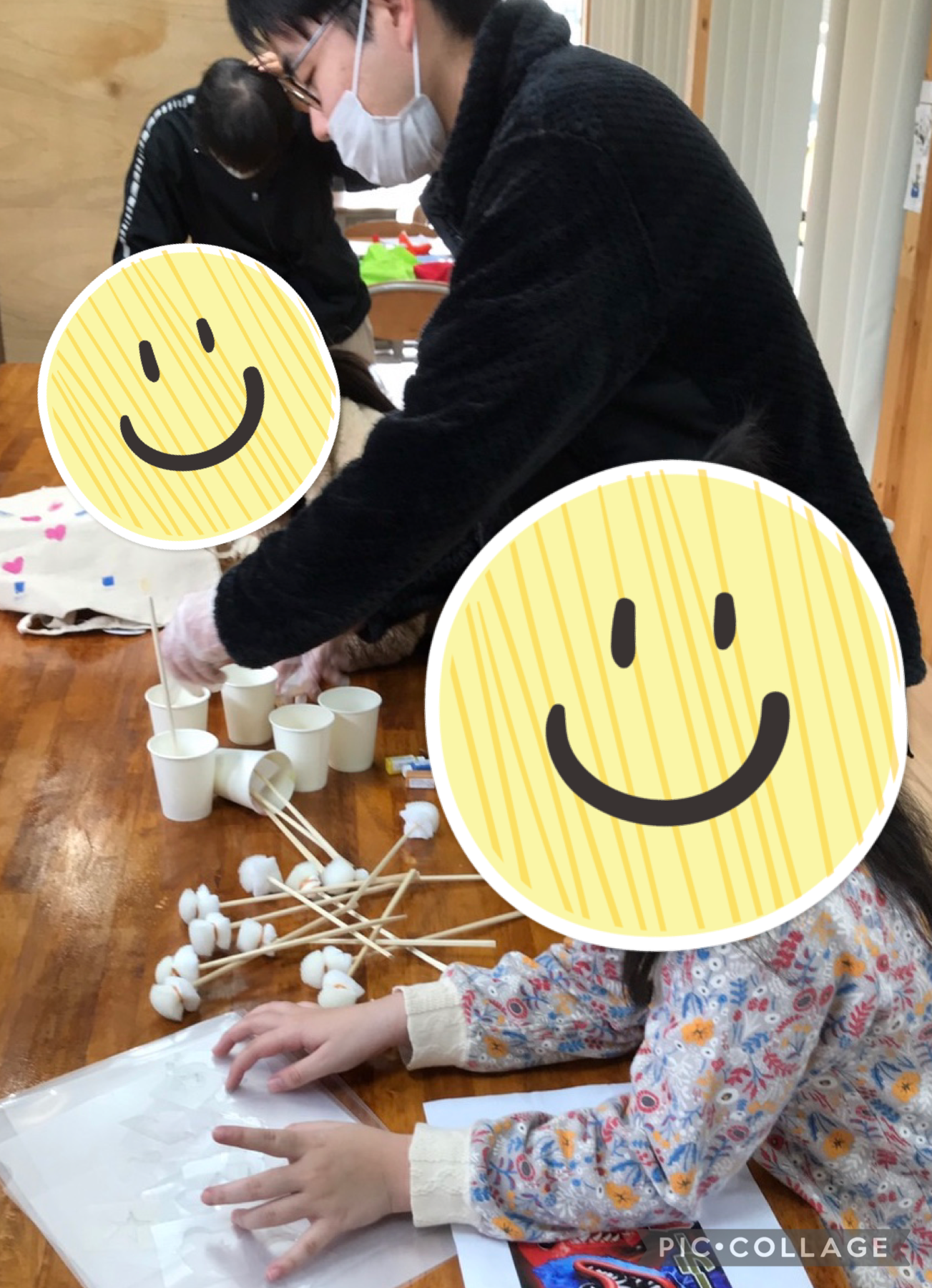 ある児童はキャラクターの目をステンシルのまるの型を使って目をつけています。また、「全部の色を使ってみる!」と言われ全部の色を使って模様をつけたり、ある児童は手に色を付けて、手形をつけていました!それぞれの児童が想像力を働かせながら模様をつけています♪また工夫をして楽しく取り組めました✨