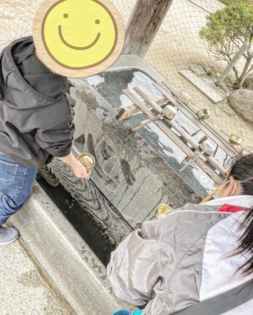 最後は今治城に行って、手水舎の作法や参拝をしました!手水舎の作法は職員が隣で一緒にしながらやったり、参拝も看板に書いてあるように見ながらしっかりと行うことができました!