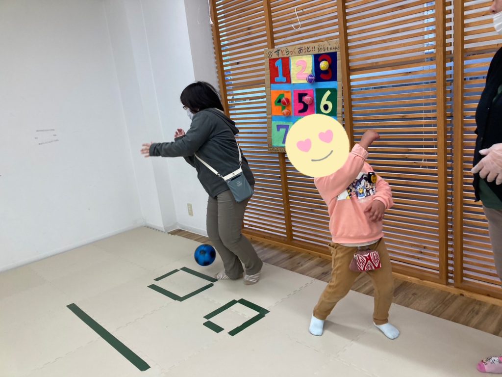 片手で上手に投げたり、キャッチしたり体全身を使って楽しく粗大運動を行うことが出来ました😊