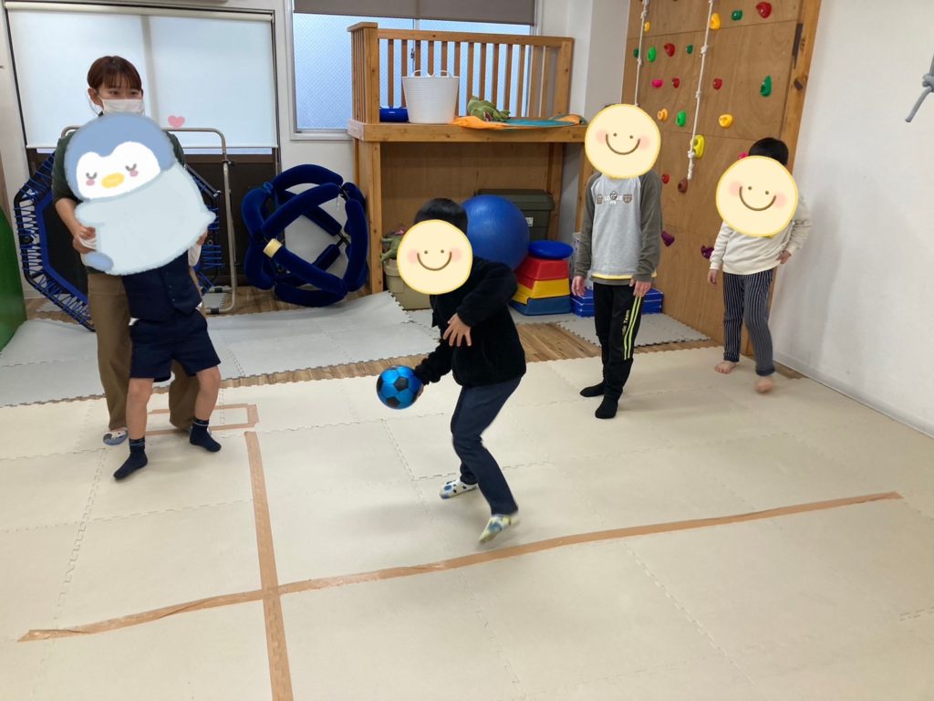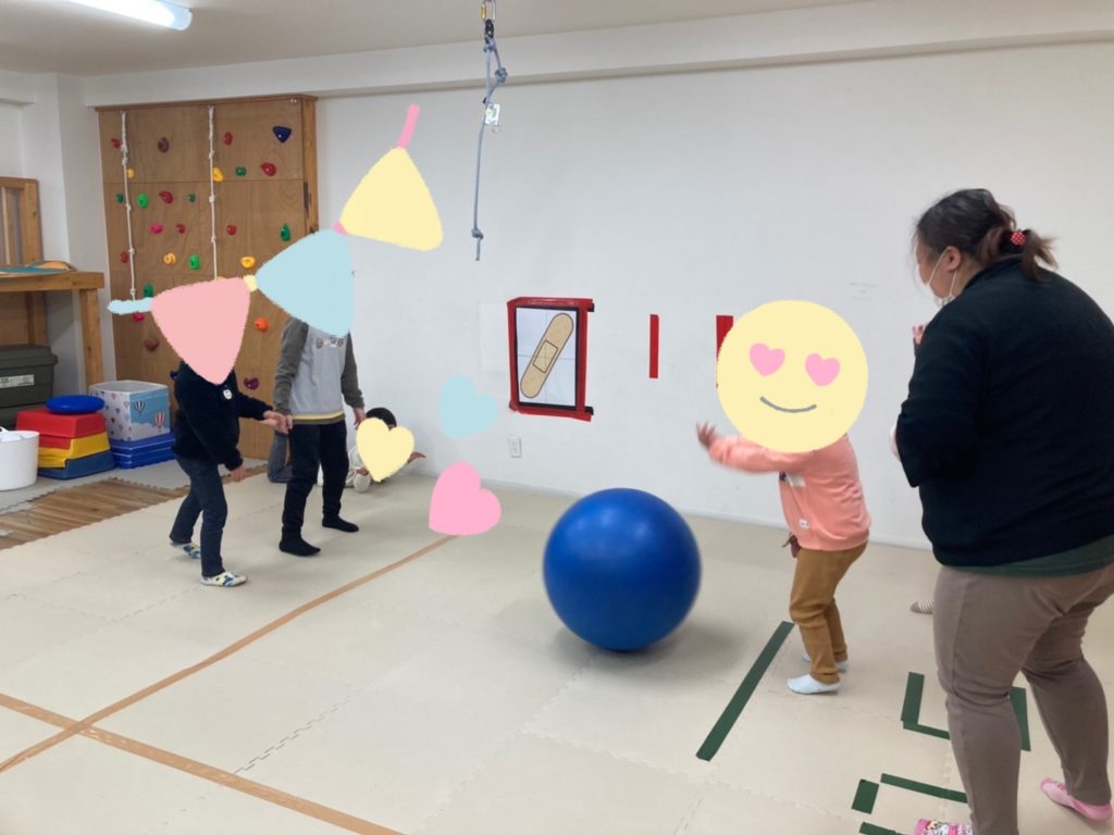 転がしドッチボールではボールをバランスボールに変えて行い、ポヨンポヨン跳ねるボールをいかに上手に転がすか考えながらゲームを楽しみました🎶