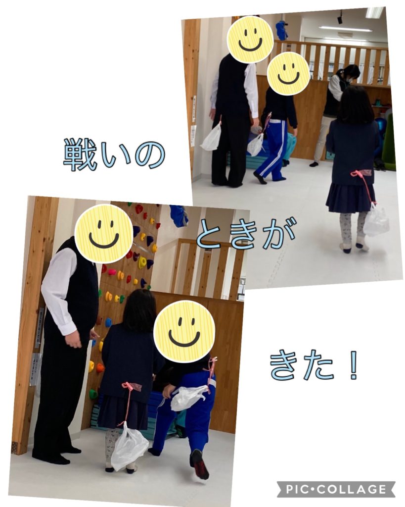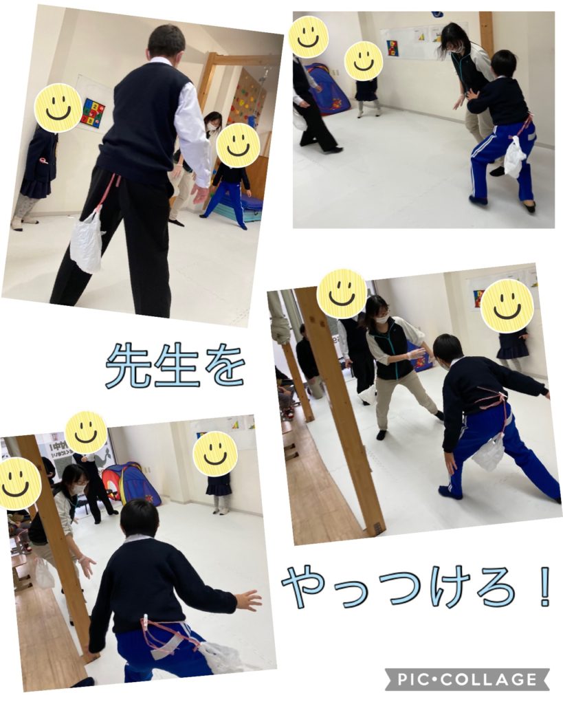 職員も参加することを伝えますと、「よーし、みんな!先生からやっつけるぞ!」と、ある1名が発言!すると「よーし!」と他の児童もやる気十分。こどもたちで一致団結して…職員はみんなの挟み撃ちに合い、あっという間にやられてしまいました😣