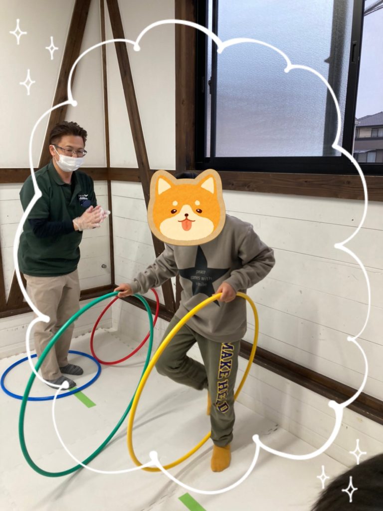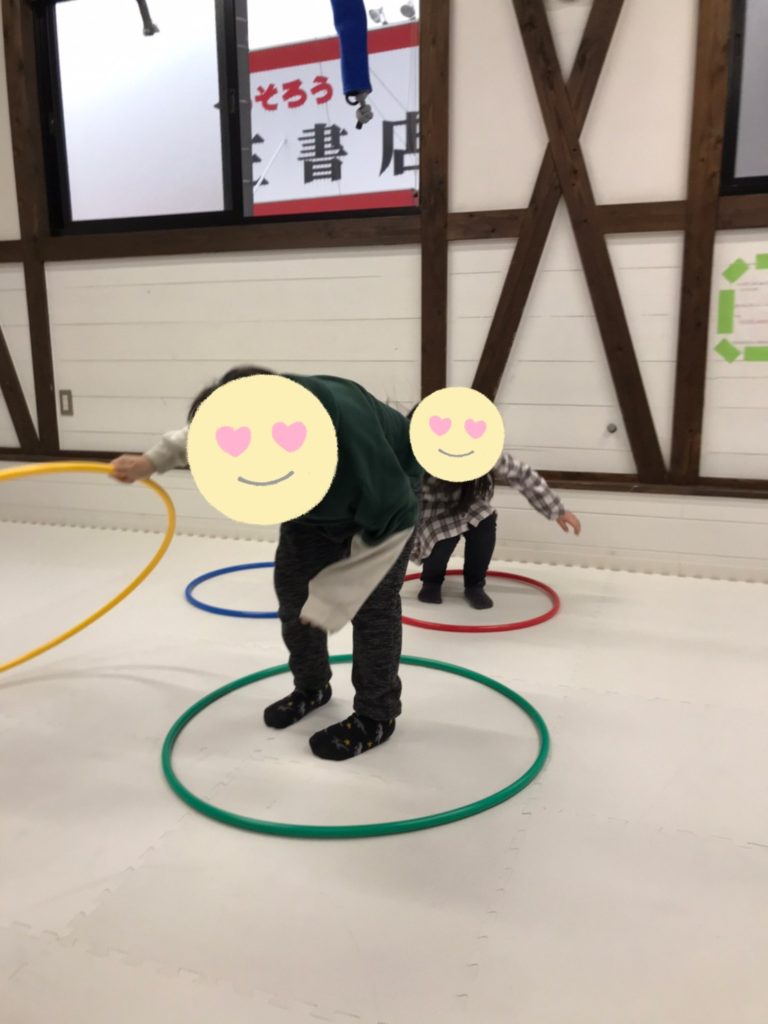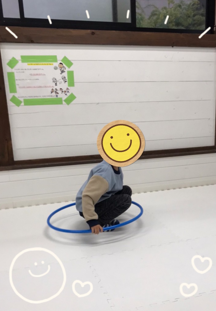今日の内容は、後ろから前へフラフープを持ってきて、フラフープの中を渡ってゴールを目指します💡