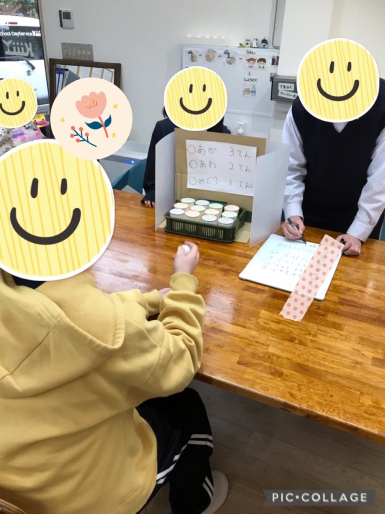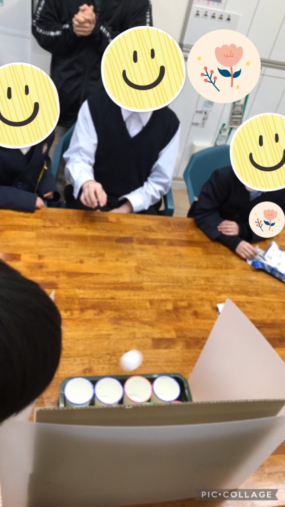 今日はみんなでピンポン入れをしました。ピンポン玉をバウンドさせて、色のついたカップに入れていきます!赤色のカップ3点、青色のカップ2点、緑色のカップ1点のルールでしました!3回ピンポン玉を投げて、合計点を計算します!ピンポン玉のバウンドが高く飛んだり、低くなったりする時もありましたが、何回も挑戦して力加減の調整ができました!バウンドの軌道が分かると、得点の高い赤色の位置を確かめながら角度を調整して投げています!みんなで入った色を確かめながら、得点を計算して伝え合いました!「得点を書く役」と「色を伝える役」を「やってみる!」と児童からも積極的にしてくれながら、「がんばれー!」「今◯◯点!」と盛り上げてくれました!最後はみんなで1番になった児童に拍手をして笑顔で終わりました!