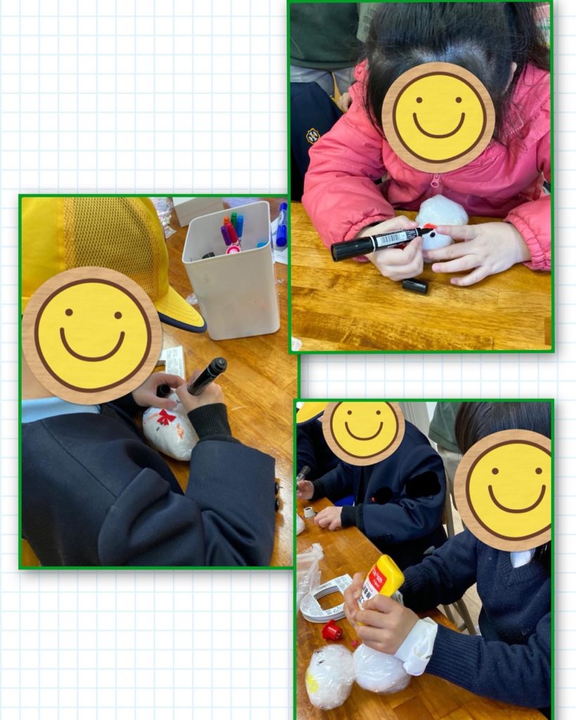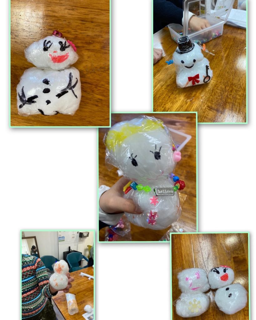 雪だるまの形ができると顔のパーツや体はペン、フェルト、ビーズなどを使って自由に装飾しています。『イヤリングもネックレスも付けたい』とビーズでアクセサリーを作ってオシャレな雪だるまなど、個性豊かな雪だるまがたくさん完成しています。