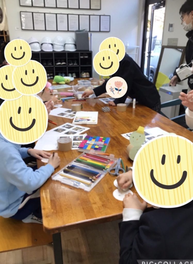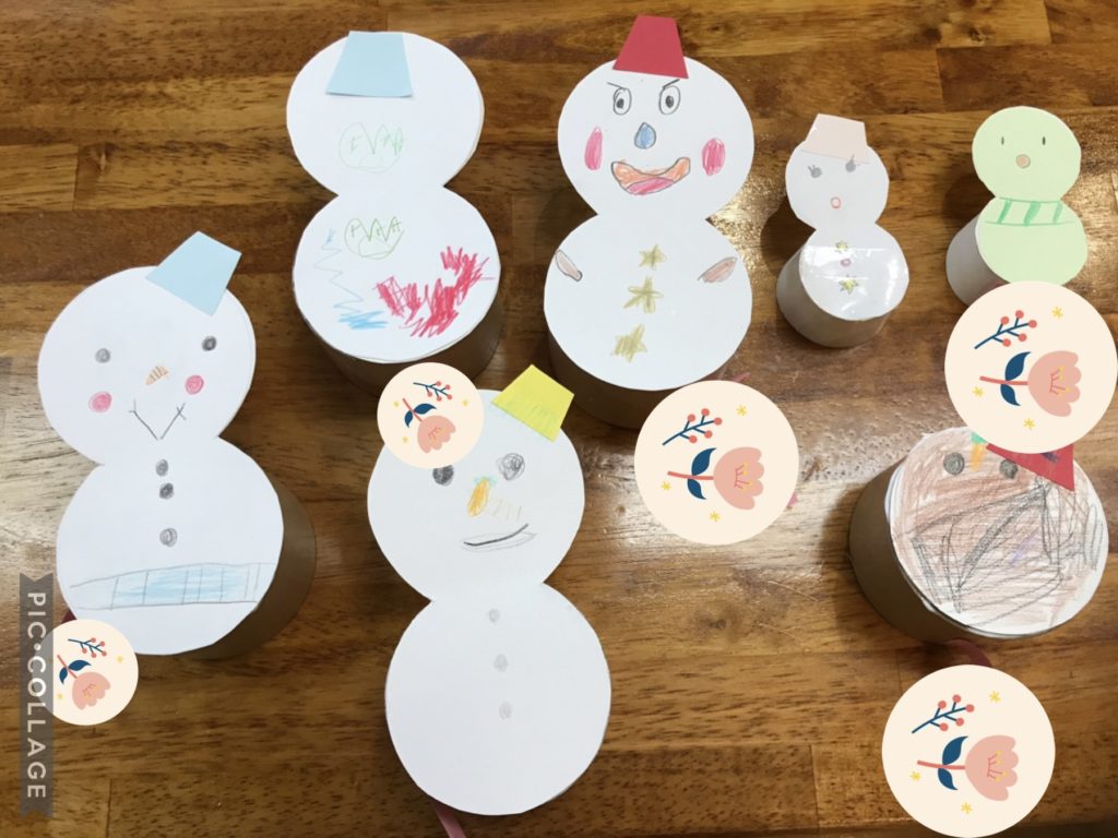 今日はみんなでゆらゆら雪だるまを作りました!ガムテープの芯や紙コップにビー玉や電池を付けてゆらゆら左右に動くように作っていきます!それにかわいい雪だるまの絵やオリジナルの絵を付けて完成です!「鼻は人参にしてみたよ!」「笑ってるようにしてみたよ!」と楽しく絵を描きました!ガムテープの芯の周りにボンドを付けていく作業では、ボンドの量が多くなって垂れないよう、ボンドが出過ぎないよう力加減に注意しながら慎重に集中をして付けていきました!完成をすると「こんなに揺れるんだね!」と大きく揺らしてみたり、「こんな風に揺らしたら楽しいよ!」とお互いに情報を伝え合いながら揺れる雪だるまを見て、しっかりと目で追うことができていました!