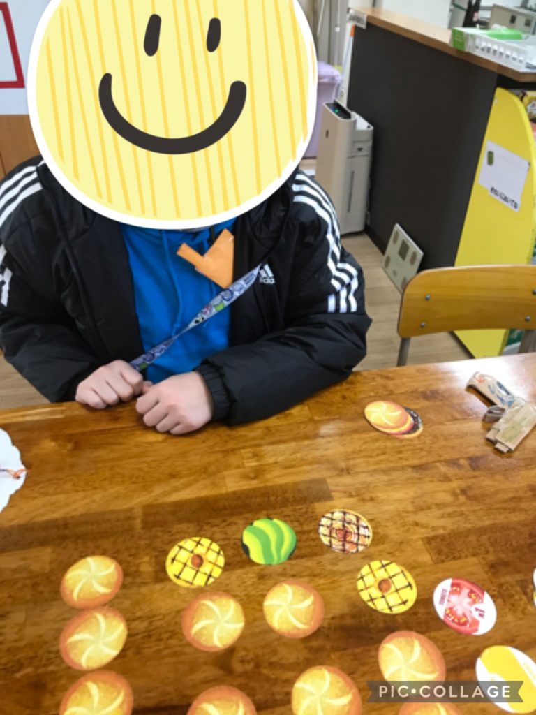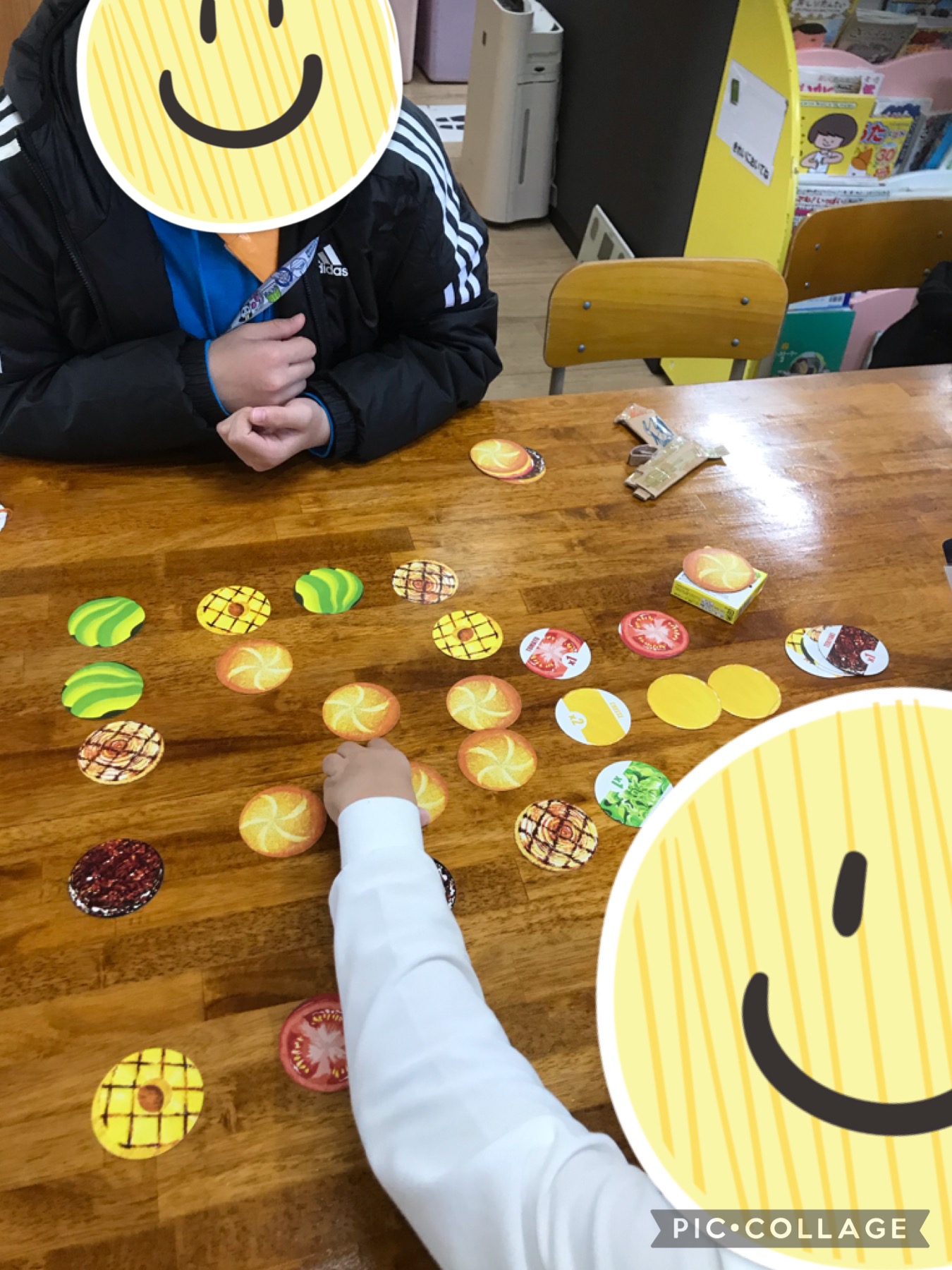 今日はアロハ!バーガーカードに挑戦をしました!親になった人は、バーガーに入れる好きな具を選びます!その注文された好きな具を注文通りになるよう、順番にカードをめくりながら具を探していくゲームです!まずは、注文をされた具の種類は何か、何個必要かを良く覚えたり、しっかりと見て確認をします!それから順番にカードをめくっていき、その具が注文された具かどうかを確かめながら具を揃えていきます!具を揃えていき、見事最後の具を引いて注文の通りに完成させた人がバーガーをゲットできます!これを繰り返して3個作れた人が勝ちです!ポイントはカードをめくっていくので、神経衰弱のようにどのカードがどの具だったかを覚えながらすると見つけやすくなります!「あとはレタスだけやね!」と残りの具は何かを覚えながらしたり、注文の具をしっかりと目で追いながら探すことができていました!勝ち負けにこだわりすぎることなく、「次は◯◯ちゃんだよ!」と優しく声を掛け合いながら楽しくバーガーを作りました!