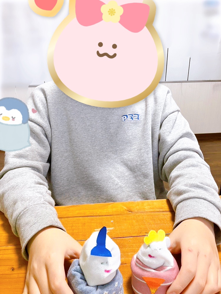 作り方ですが、靴下を裏返して、2枚重ねます。そして、くるくる巻いて形を整えて、最後に、飾りを付けたり描いたりして完成です。