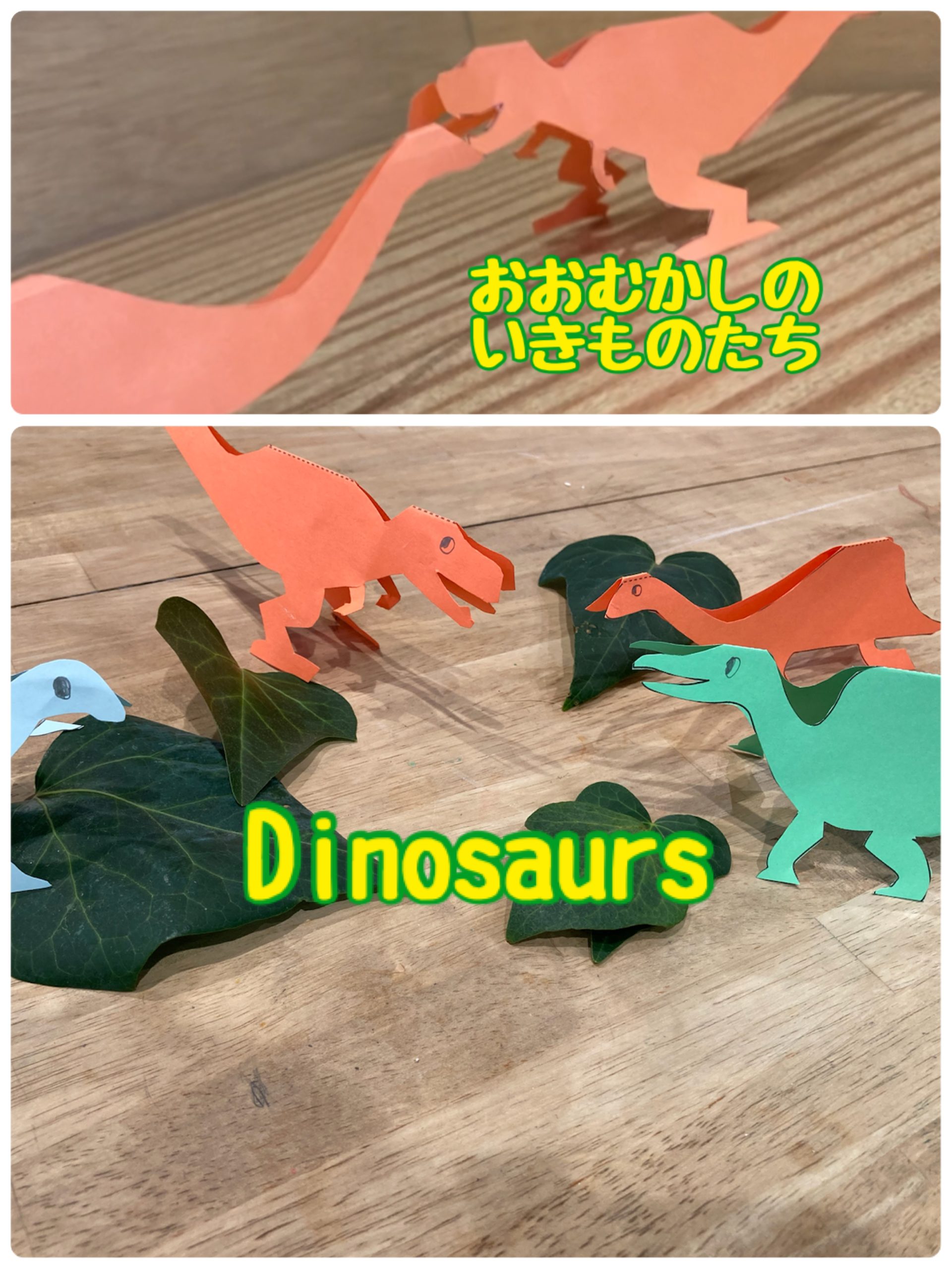 すでにいなくなったとされる昔の生き物が切り絵で復元でき、オリジナルの「中生代の世界」を創造できるのが恐竜の切り絵かもしれません。他の児童にも恐竜の色を変えたり、色を塗ってもらったりして、オリジナルの昔の世界を作ったもらいたと思います。