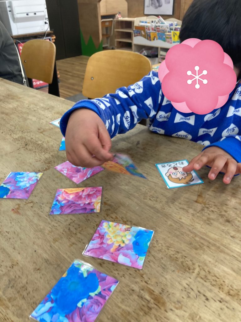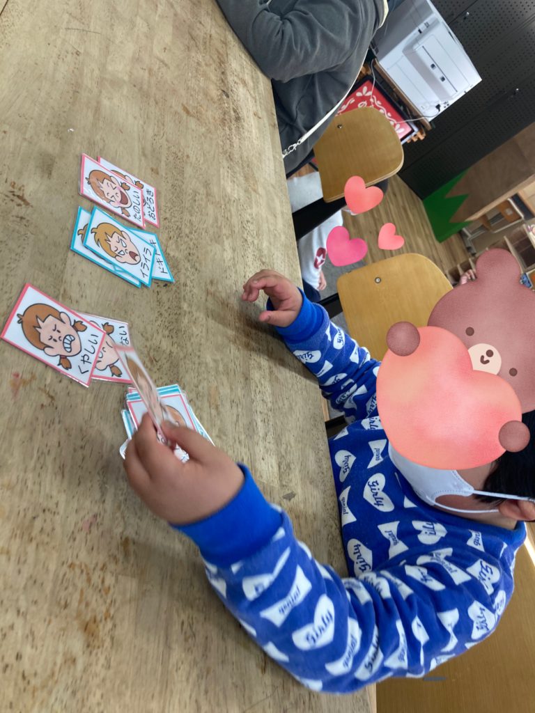 こども達に1枚引いてもらって自分が持ってるカードと同じ表情のカードを探してもらい、最後に同じ表情を真似してもらいます☺️