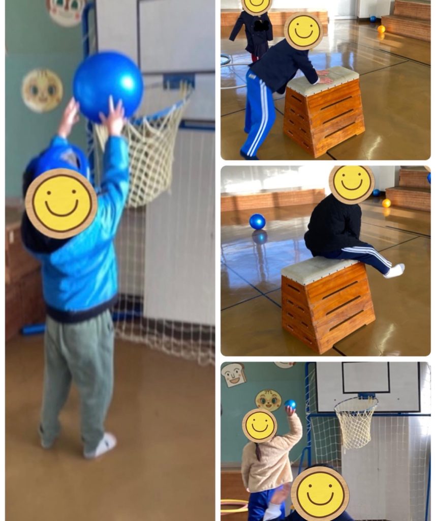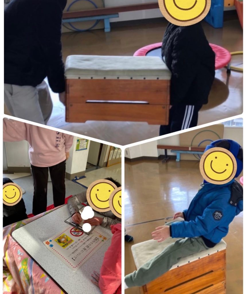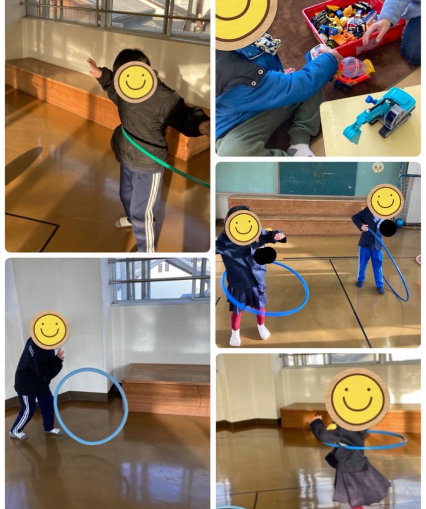 たくさんの玩具、図書の本、跳び箱、フラフープなどがありました。フラフープをたくさん並べてリズム感覚、足腰の強化を促すケンケンパも楽しみました。