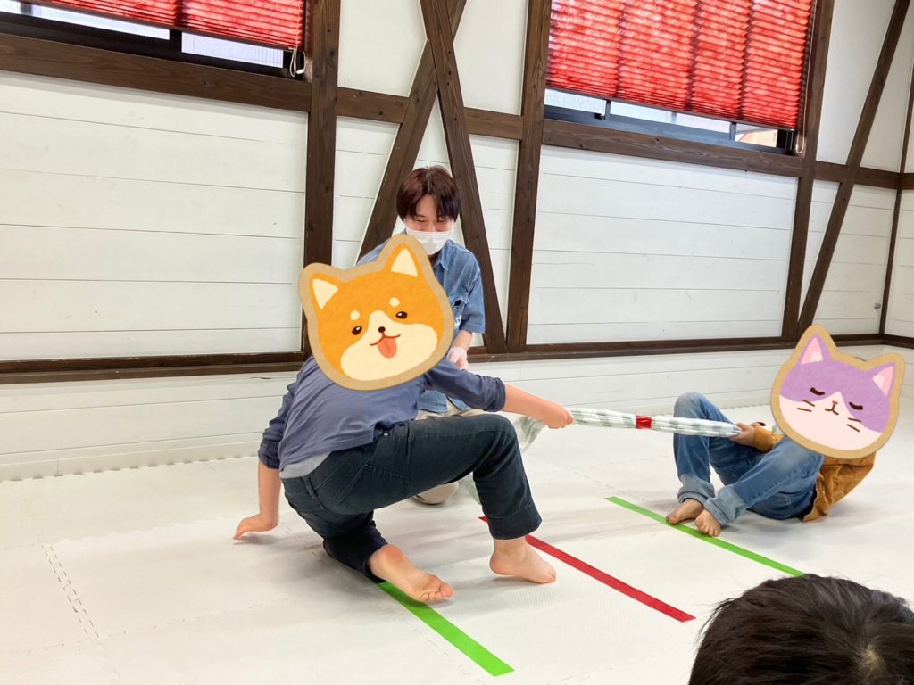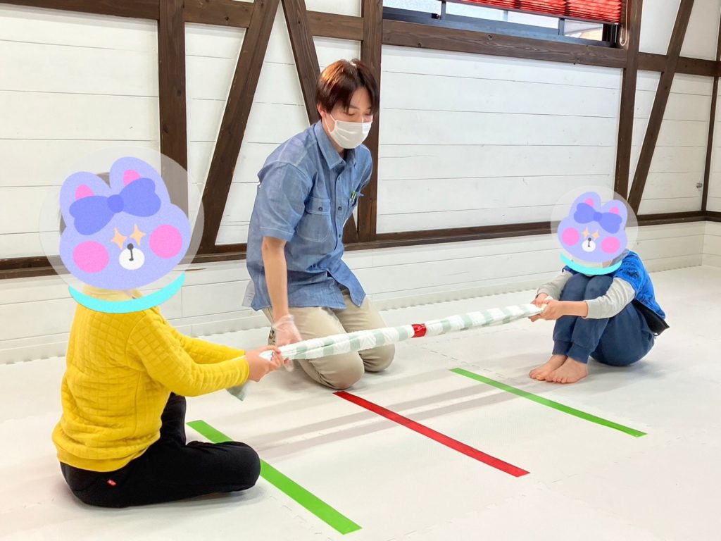 こどもたちは、座り方やタオルの握り方を変えながら、自分の方に引っ張ることができるように、工夫している姿が見られました。