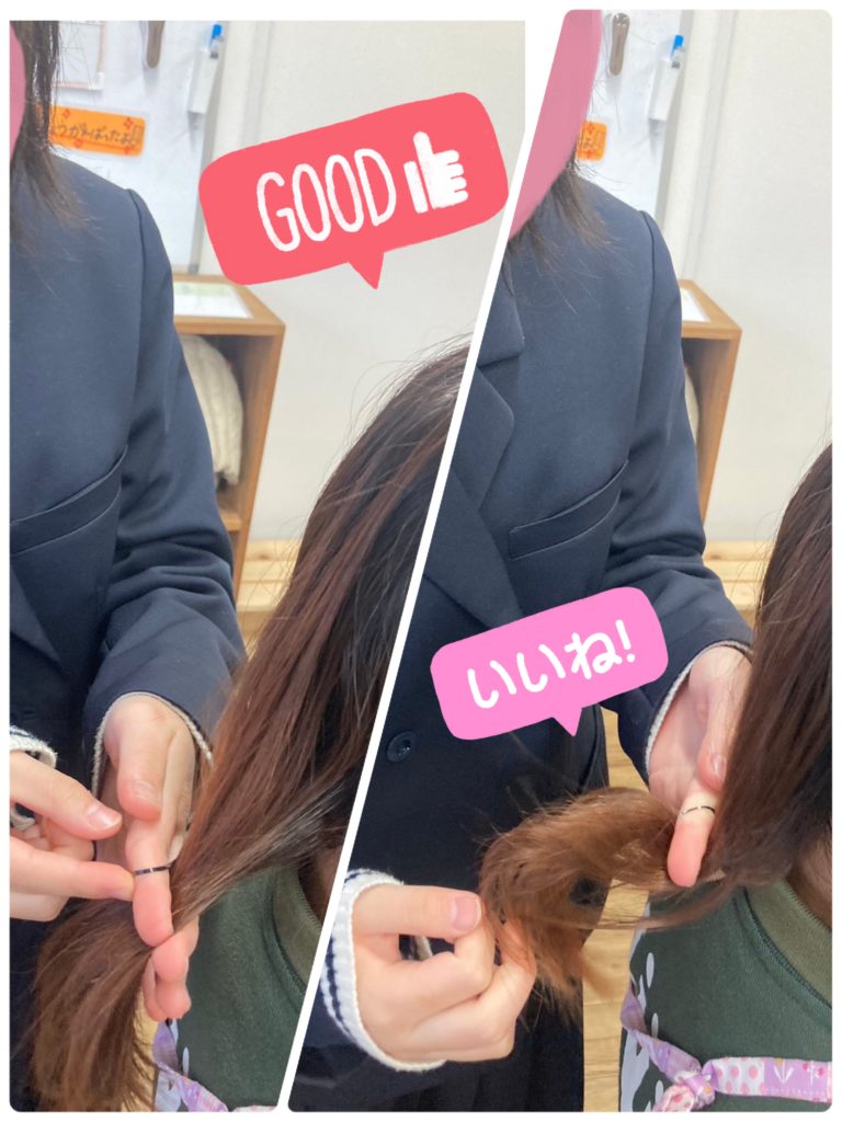 髪をまとめるのに髪の毛が落ちてきたり、ゴムを結ぶのに力加減が苦戦していましたが…