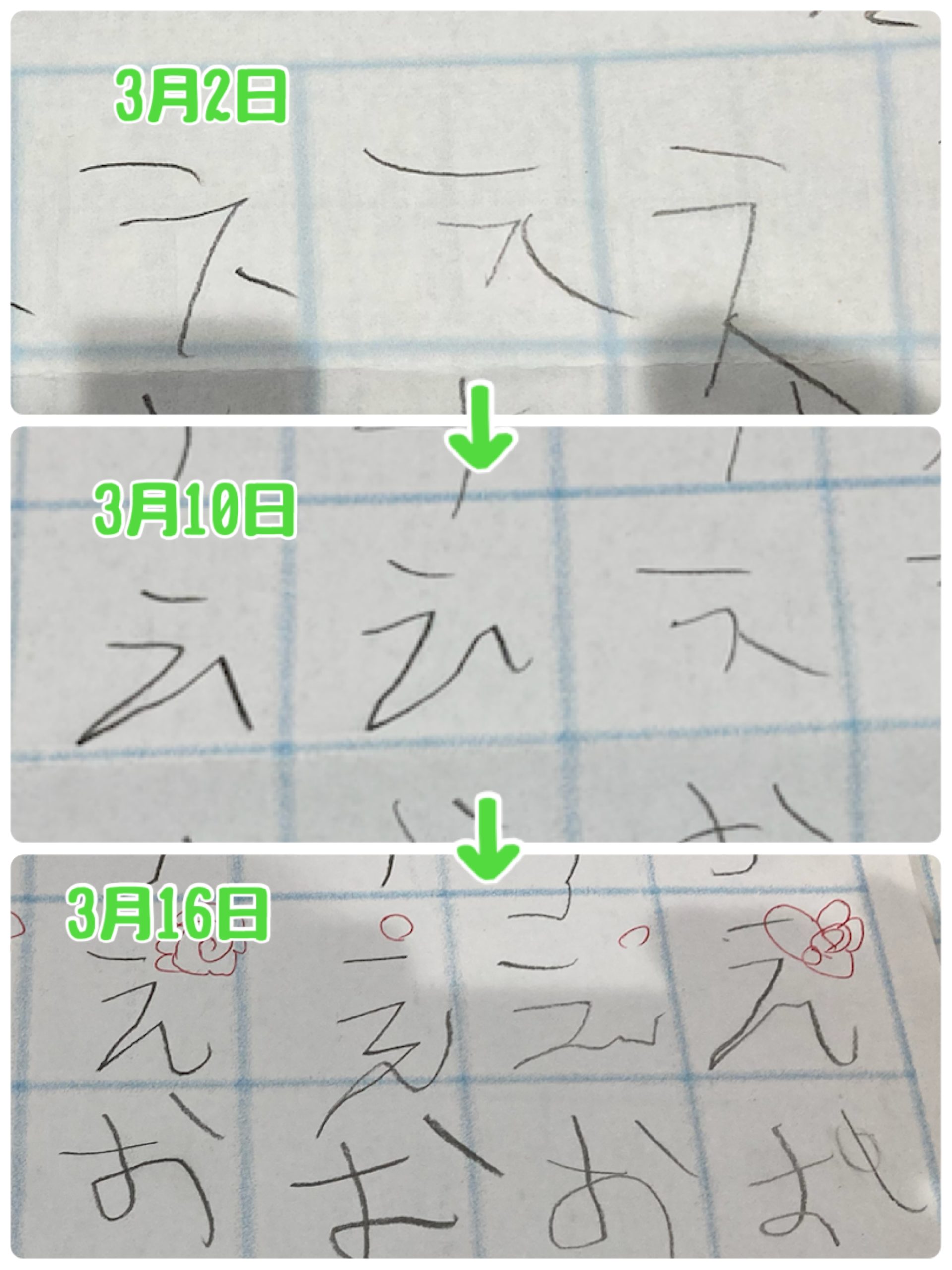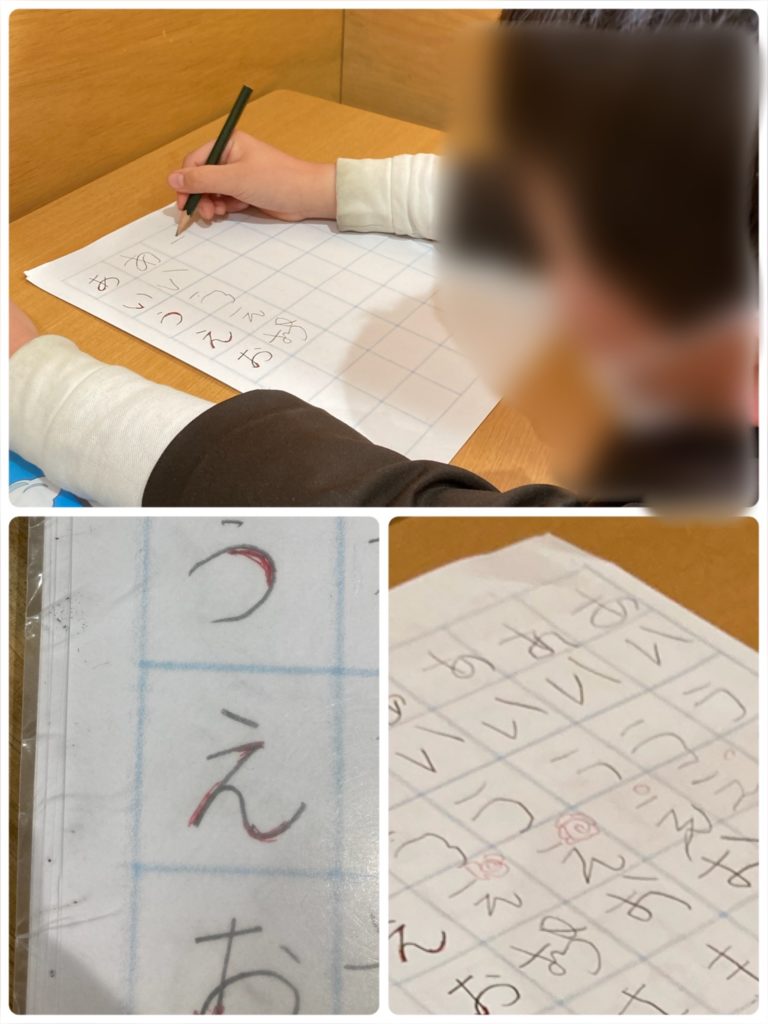 少しずつこれからもひらがなの練習を行っていきますが、1ヶ月後にどう変わっているか楽しみです。一緒に工夫するところを探しながら練習を進めていきます。