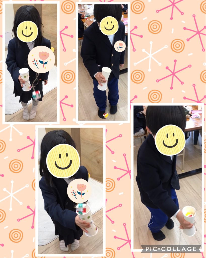 そして、ティッシュを2〜3枚丸めてビニールテープで固定したもの(玉)を、もう一方の紐の先に留めたら完成✨