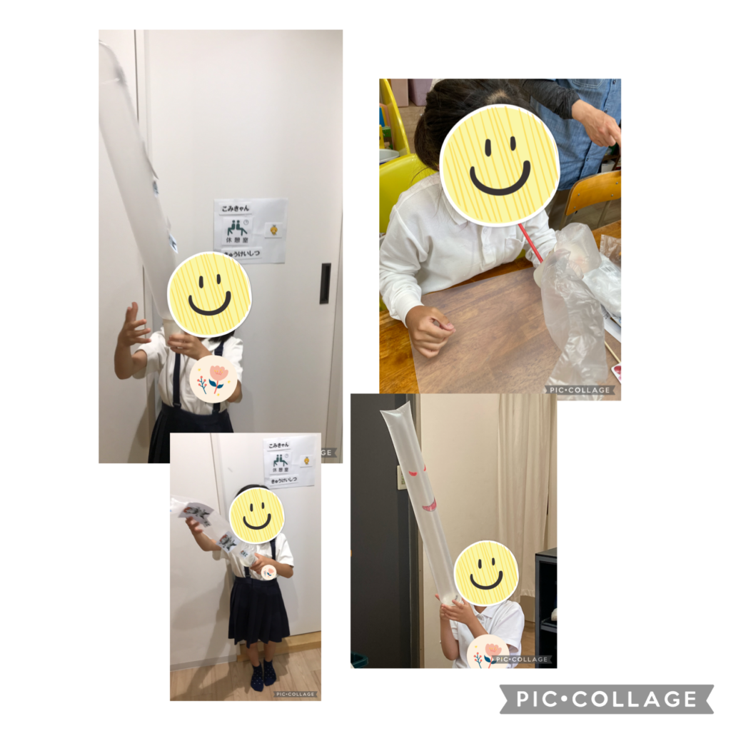 ナイロンに自分の好きな顔のおばけを描いたり、好きなキャラクターの画像を職員と一緒にパソコンなとで探し、コピーしてもらった画像を切ってビニール袋に貼っている児童もおられ、創造力を働かせながら取り組むことができました♪
