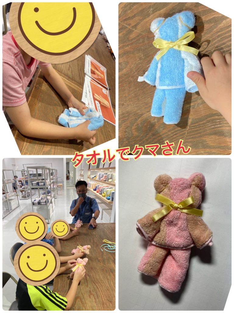 また、工場見学の後は、今治タオルを使ってクマさんを作る無料のワークショップにも参加しています😊💕