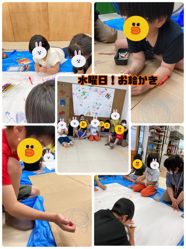 水遊びの予定でしたが雨天中止となり室内で段ボールやとりのこようしにクレヨン、色ペンを使ってお絵描きをしています。好きなキャラクター、ものなど可愛いイラストをたくさん描いてくれました✨