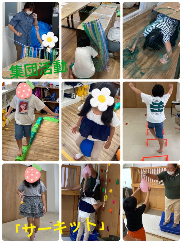 キート内で集団活動「サーキット」をしています。ダンボールで作ったトンネルをくぐって