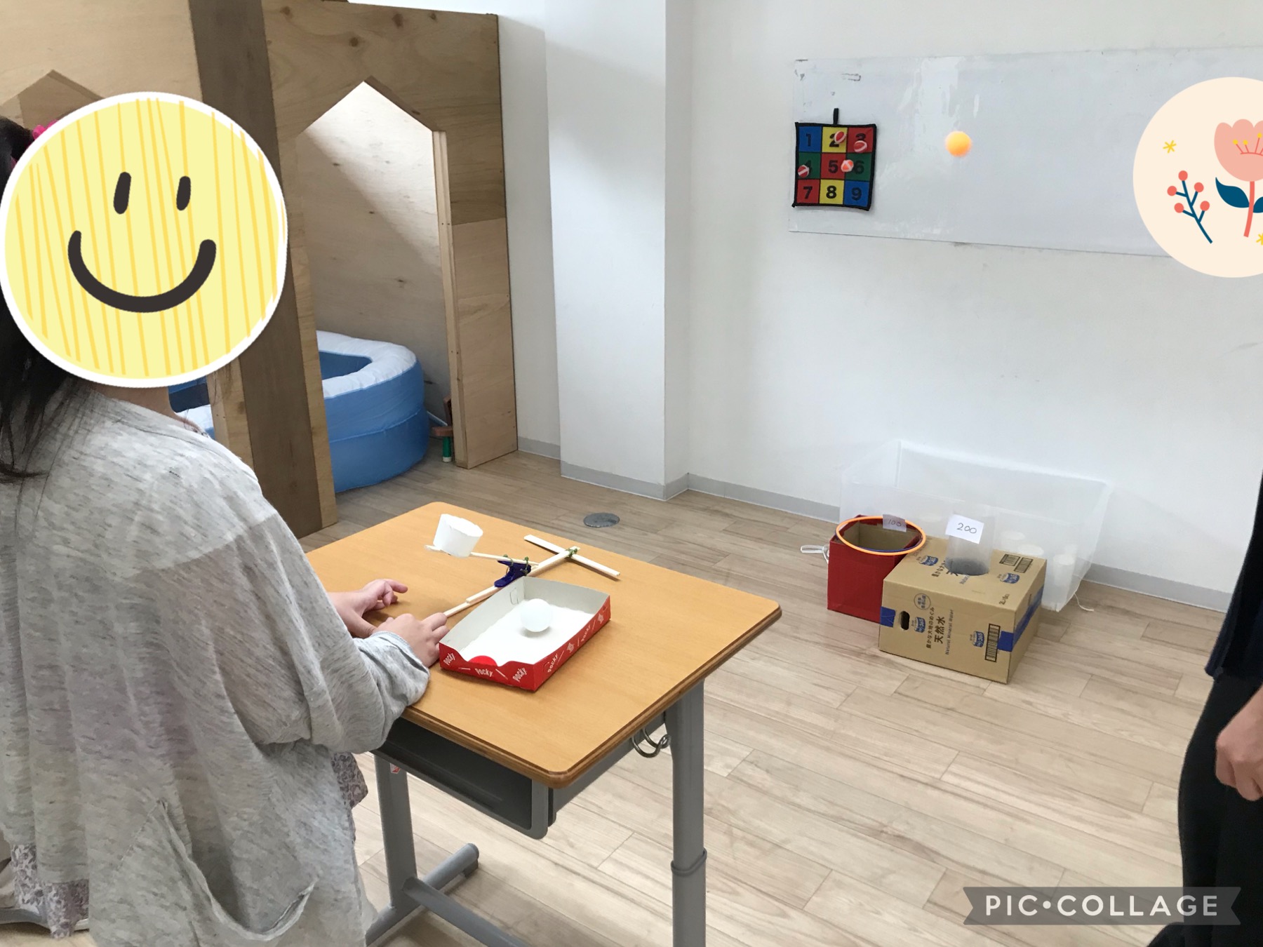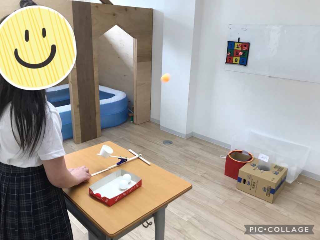 みんなでピンポンシューティングを楽しみました!ピンポン玉を飛ばす装置を使ってピンポン玉を飛ばします!指先を使って弾くと飛ぶ仕組みです!得点箱を距離や大きさ、点数で分け、「私は近いところ狙う!」「大きいところの方が入りそう」「オレは点数が高いところを狙う!」などと狙いを定め、しっかりと方角を決めて弾く力を調整しながら飛ばしました!チャンスは3球!黄色いボールは得点が3倍になるなど逆転の要素も入れ、何球目に使うかを考えながら挑戦しました!中学生が司会、進行をしてくれ、順番決め、得点係も積極的にしてくれました!みんなで得点の確認を行い、楽しく計算できました!