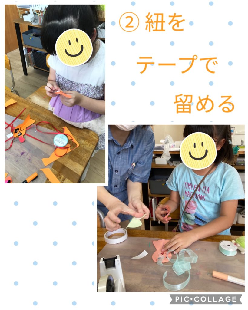 ② 紐を選んで、1枚の裏側にセロハンテープで貼り付けます。