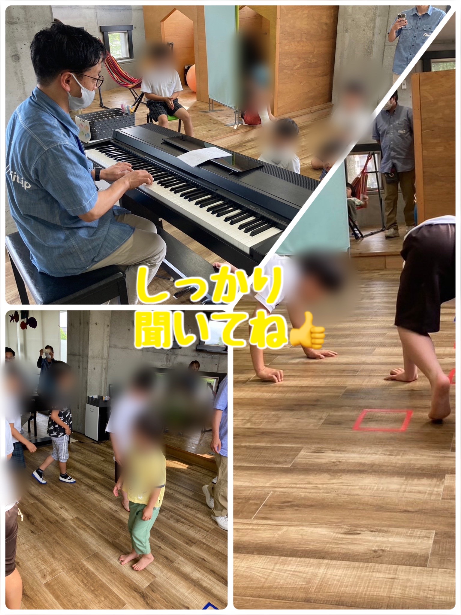 今日は即時反応というリトミックでは基本的な活動のようなのですが、ピアノを弾きながら児童に進め方を伝えています。左手の音符に合わせて歩く、走るなど行ったり、音楽を止めたりしています。途中からはあるコードを弾いたらしゃがんだり、回転したり、ジャンプしたりと動作を増やしました。