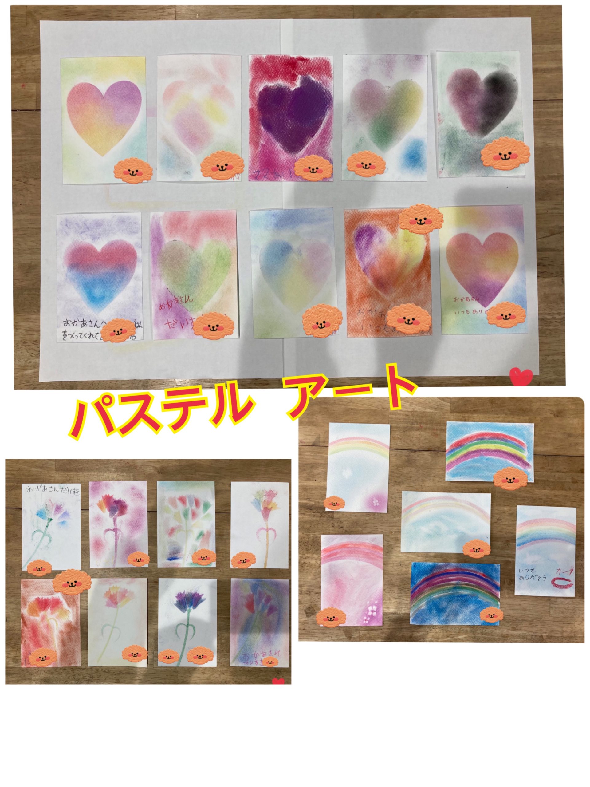 1回目は「ハート❤️」、2回目は母の日に向けて「カーネーション」、3回目は「🌈虹とアジサイ」を描きました😊
