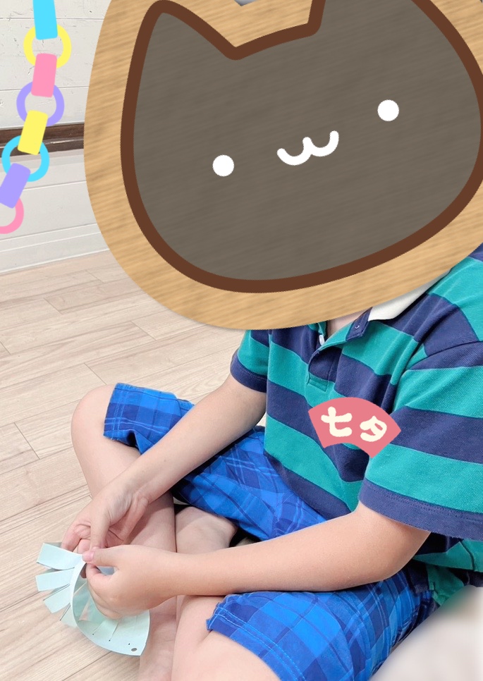 お友達を見たり、お友達に聞いたり、時々、先生に手伝ってもらいながら、こども達は、指先を使って『七夕飾り』を作りました。