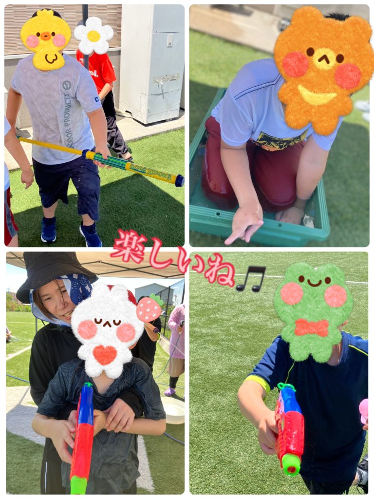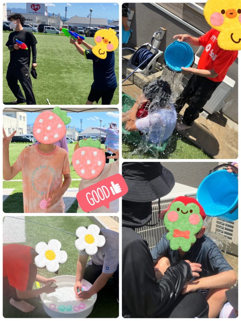 こども達は水鉄砲やシャワーのホースを使って職員に水を掛けたり、バケツを使って頭から水をかけて「きゃー」と言って喜んで楽しんでいました😄♪