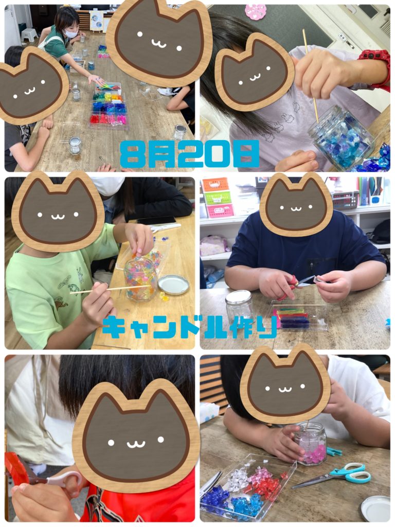 外部から講師をお招きしキャンドル作りをしました🕯みんな講師の方に注目し、話を集中してきいて取り組んでいました。キャンドルの中に詰めるジェル状の物を7色選び、ハサミで講師の方に言われた大きさに切っていきました。皆んな綺麗な色合いのキャンドルを完成させていきました✨️