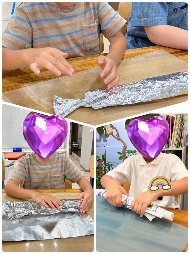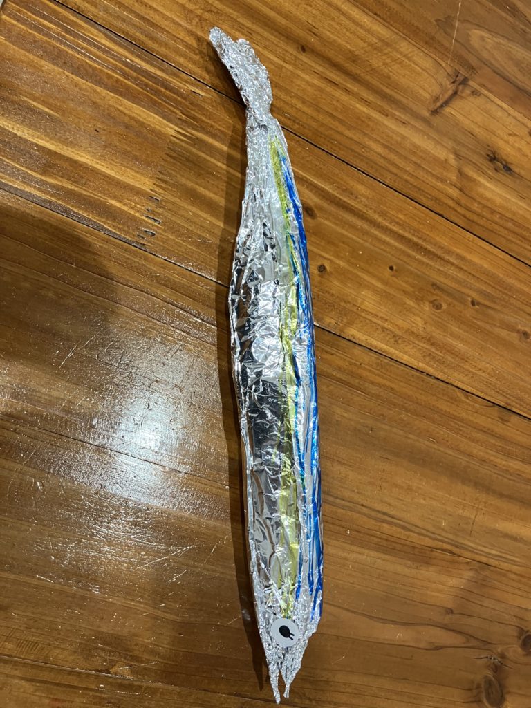 ⭐️サンマは広告を形に整えてアルミホイルで優しく巻きました。手指の強弱が必要でした!サンマのしっぽにこだわる児童、ウナギができたー‼️とサンマとはちがって(笑)個性的な魚の完成でした。
