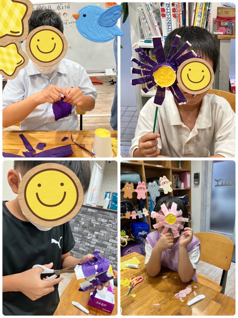 ⭐️ふんわりコスモスは、紙コップにお花紙を貼って間隔をあけながらハサミで切りました🌸今回は紙コップに線を書かずに切ることに挑戦をしました👍