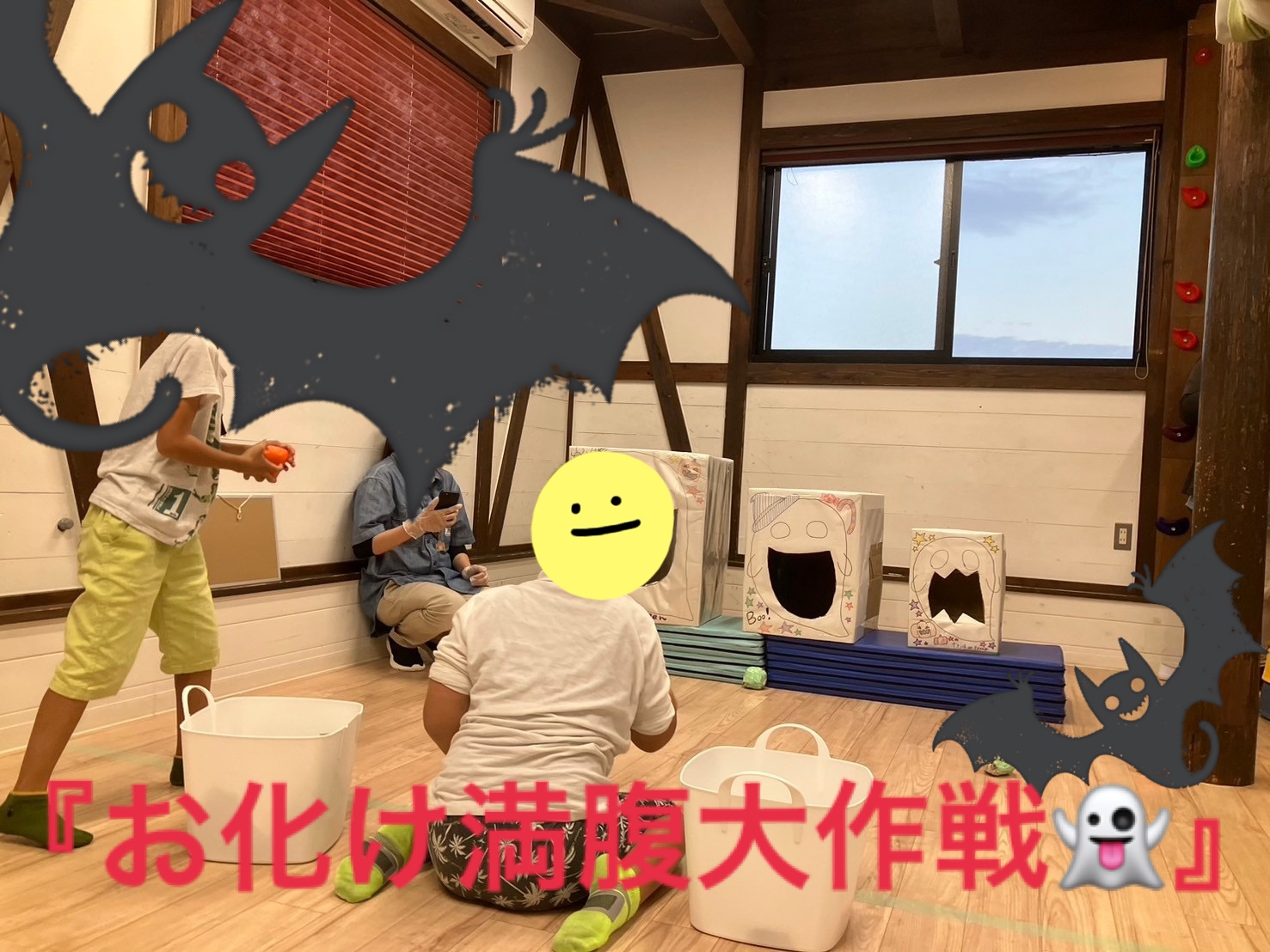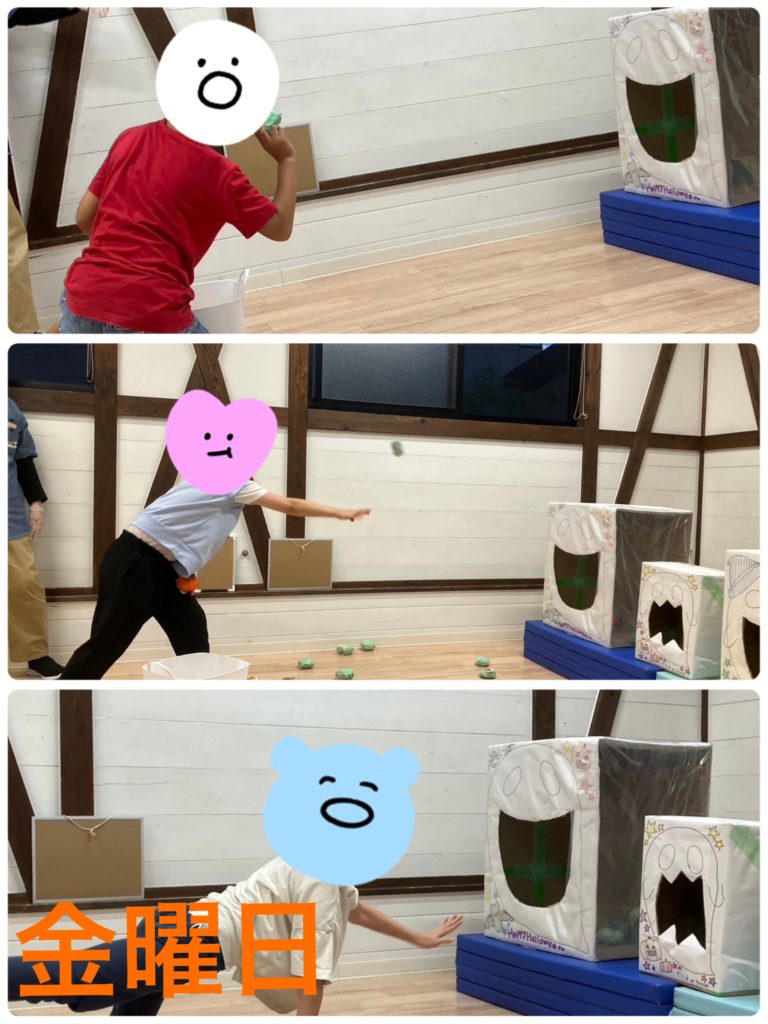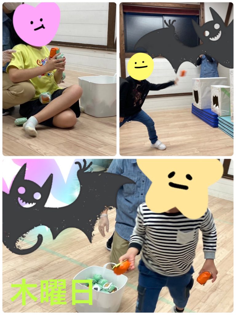 今週の集団活動は「👻お化け満腹大作戦🍙」でした。制限時間1分間にお化け👻の箱の口に食べ物🍙の絵が貼ってある球を投げ入れるルールで取り組んでもらいました。